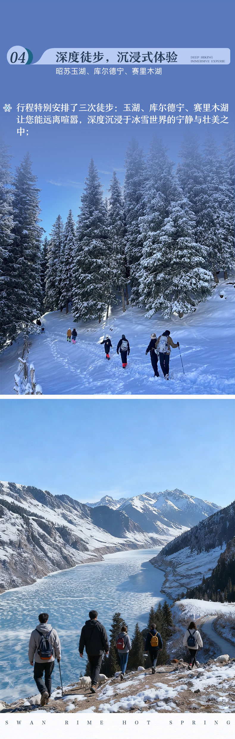 如遇气温原因,赛里木湖冰层没有冰冻结实,无法安全徒步穿越,改为徒步松树头登高往返3-4公里。