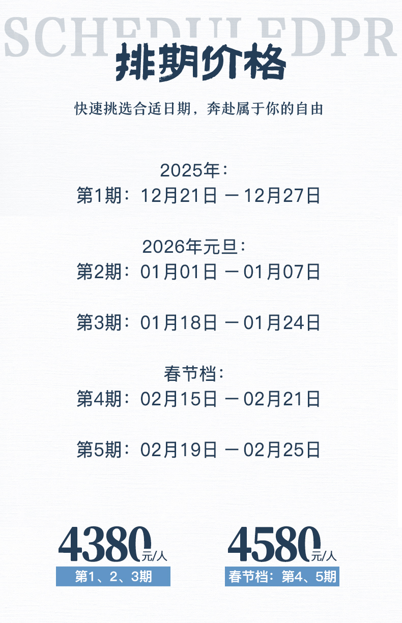 2、本路线活动定金1000元/人,您在安排好假期和往返交通之后,请尽快支付定金确认报名,我们不以任何口头承诺而预留名额。
