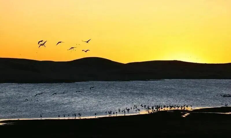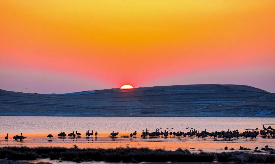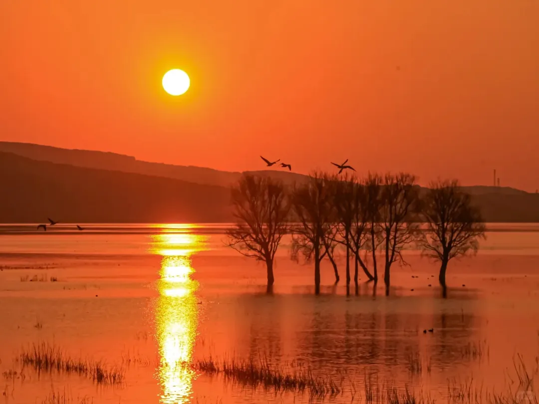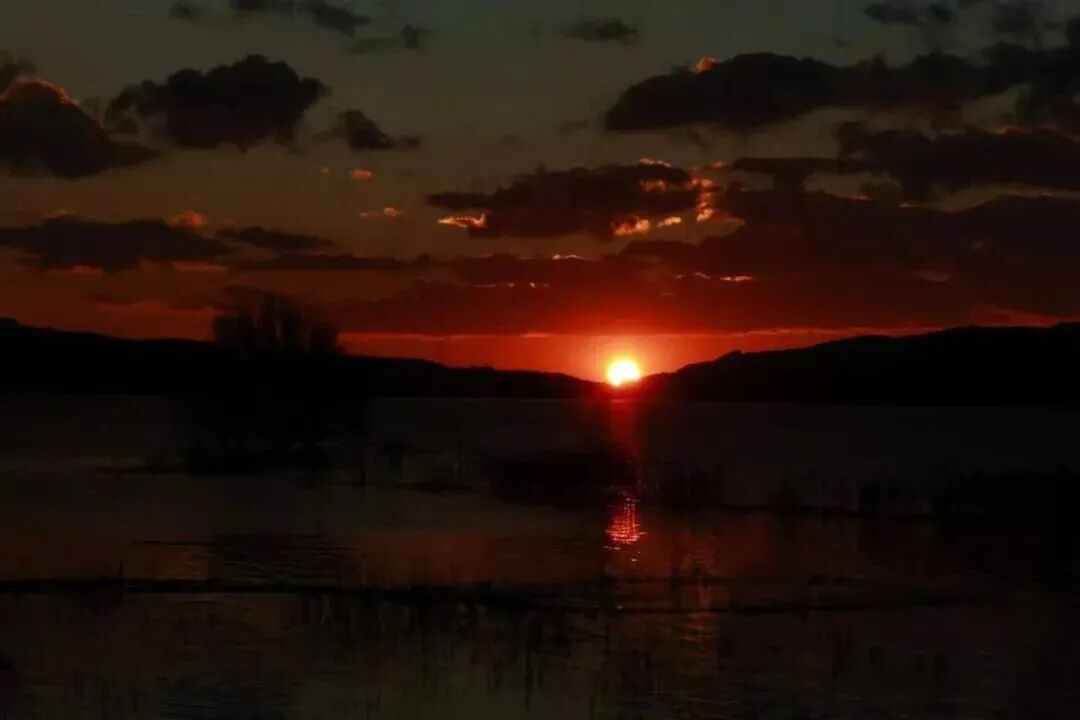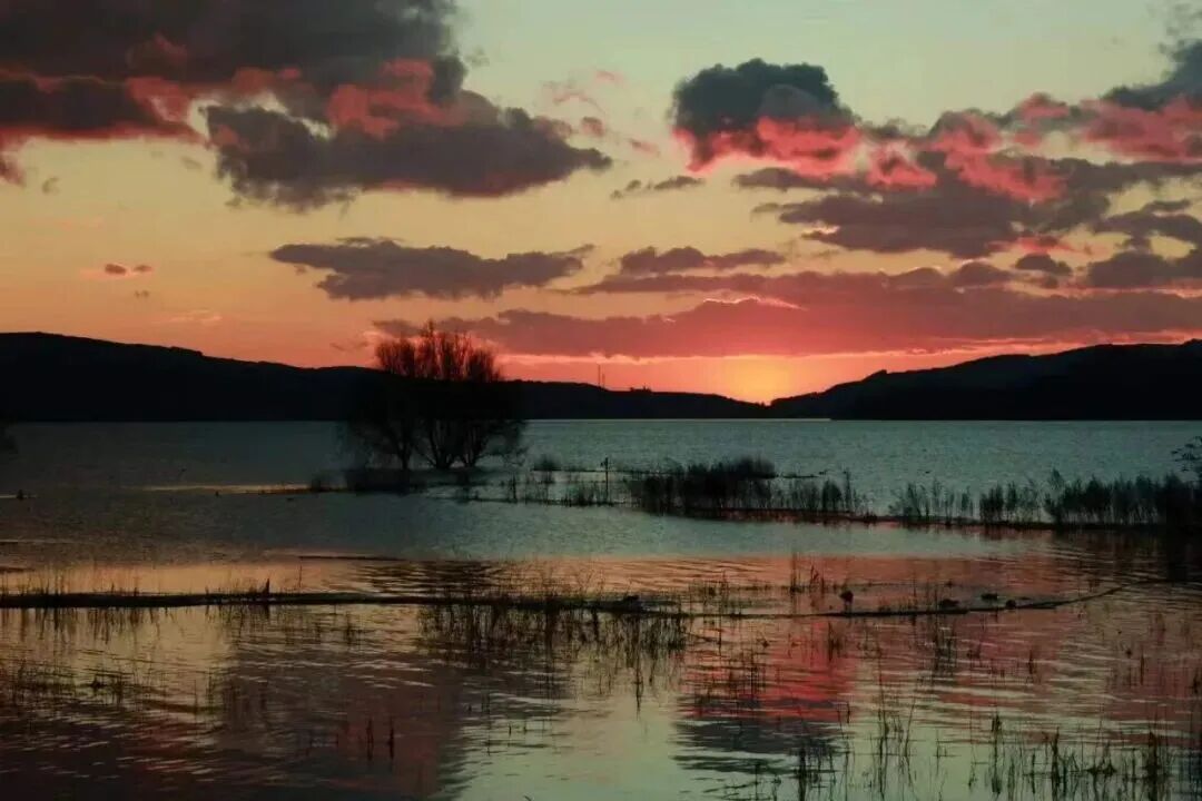 ▶宁静的水面,静寂的山峦、深深的湖水、红色的土地,在灵动的候鸟引领下,展现动感的画卷,成为摄影家和驴行者的天堂,在夕阳下呈现出美丽如水的画面。夜晚,以水中的树木为前景,拍摄念湖的星空。