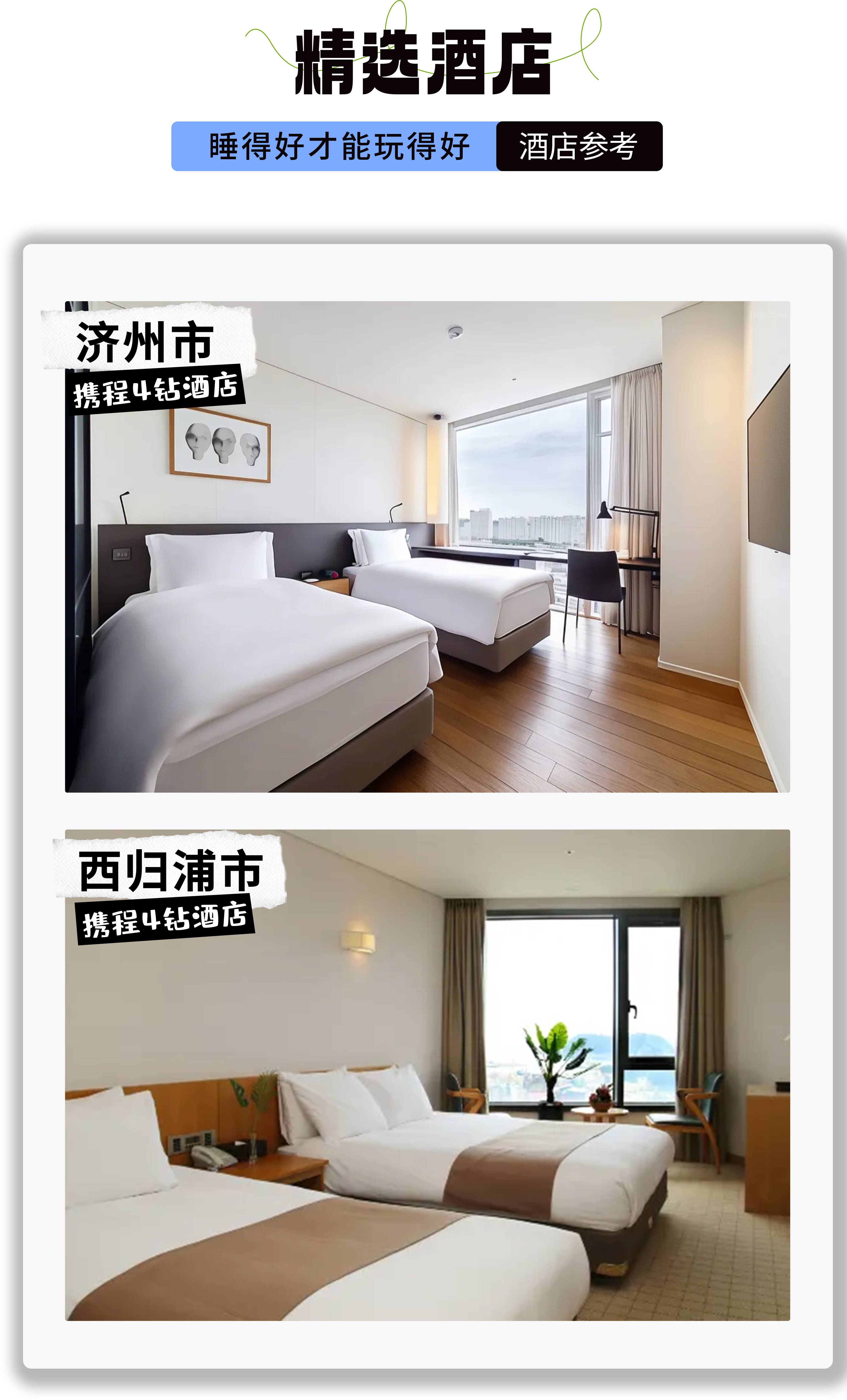 住宿:两晚济州市四钻酒店、两晚西归浦四钻酒店;