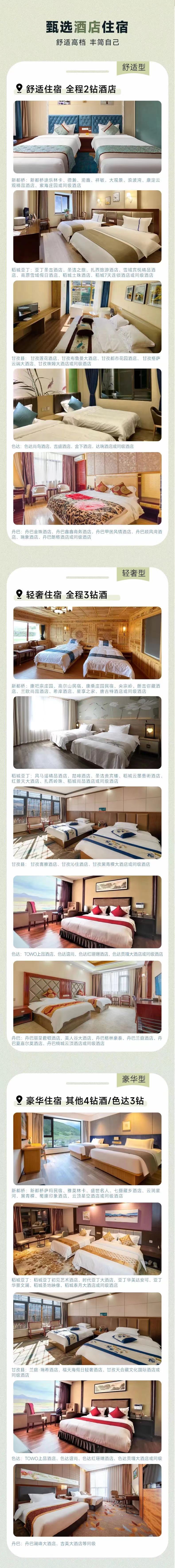 稻城/日瓦:稻城亚丁初见艺术酒店、时代亚丁大酒店、亚丁华美达安可、亚丁华景文澜、稻城亚丁贡金莲日酒店、亚丁智选假日、稻城圣地映像、稻城泰月大酒店或同级酒店