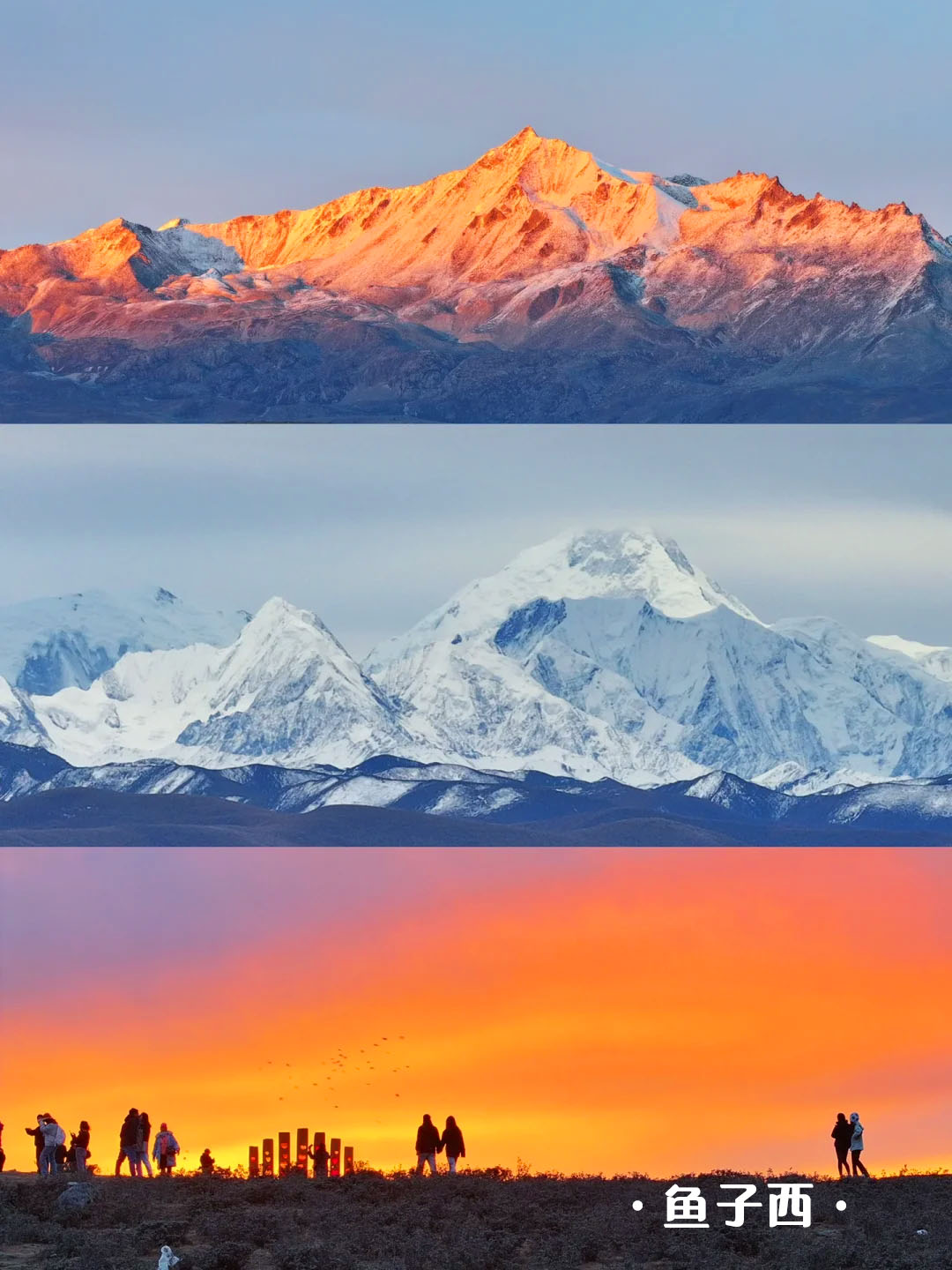 15:30-16:30 鱼子西属于木雅贡嘎地区, 拥有以藏传佛教为基础的基本文化特征, 项目范围内可 360 度遥望藏区四大神山之一藏区 ,为贡嘎西坡地区难得的观景摄影点下午在鱼子西自由创作拍大片,看完晚霞开始返程