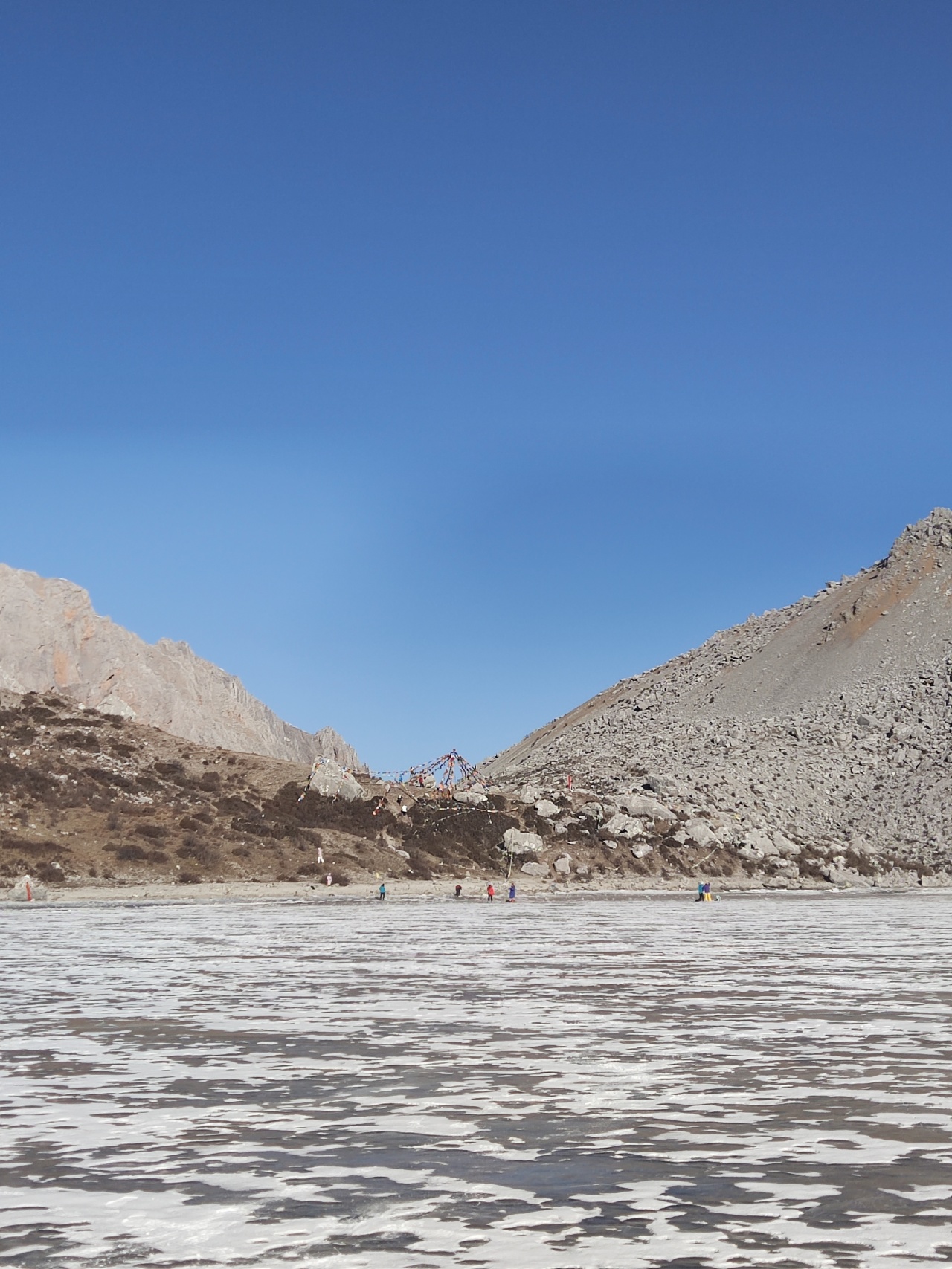 ▶ 随后抵达红星岩海子核心区域,湖面在冬春季节会完全冰封,冰面布满自然冰裂纹,澄澈处能看到水下的蓝冰,赤色的红星岩壁垂直矗立在湖畔,光影下形成“红岩映冰湖”的绝美景象。可在安全区域停留打卡拍照,拍摄雪山冰湖大片,在领队规定时间内返程按原路线回撤,下坡时需注意碎石路段防滑。