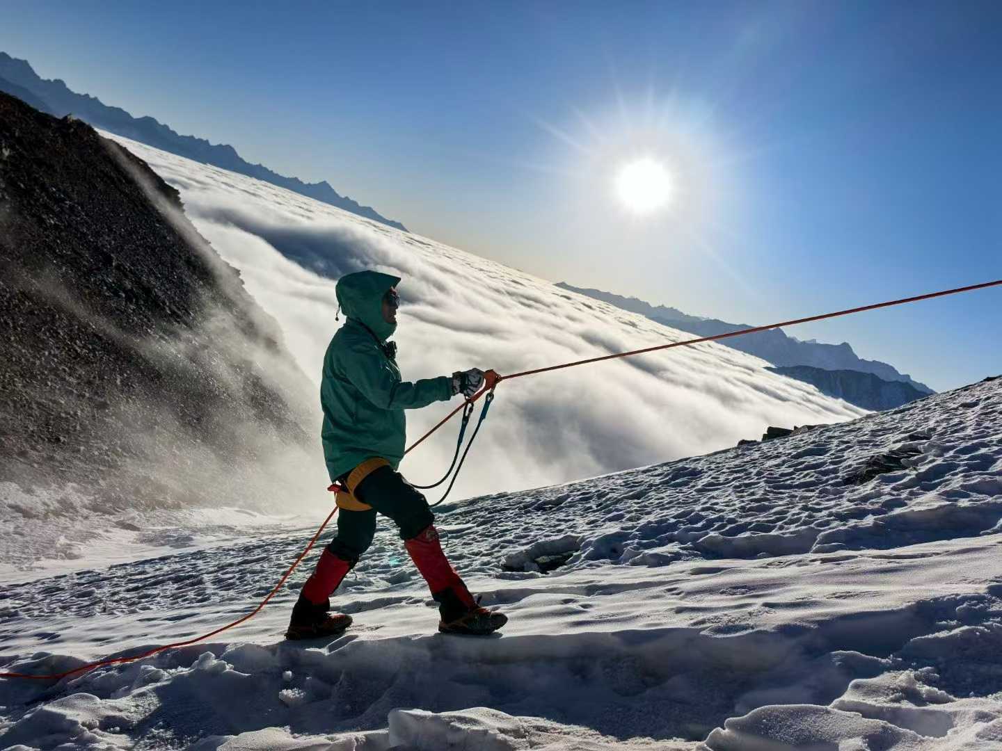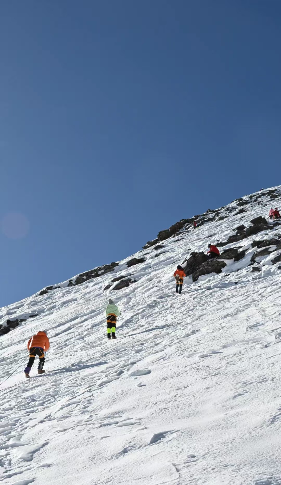 ▶行程概览:凌晨5点左右,我们在头灯的光束下出发,开始高海拔徒步攀登。在抵达冲顶保护站前的技术路段时,我们需停下,严格穿戴好头盔、安全带等专业装备,在领队保护下通过。成功跨越后,将在晨曦中抵达扎纳谷打卡点,欣赏壮丽日出。