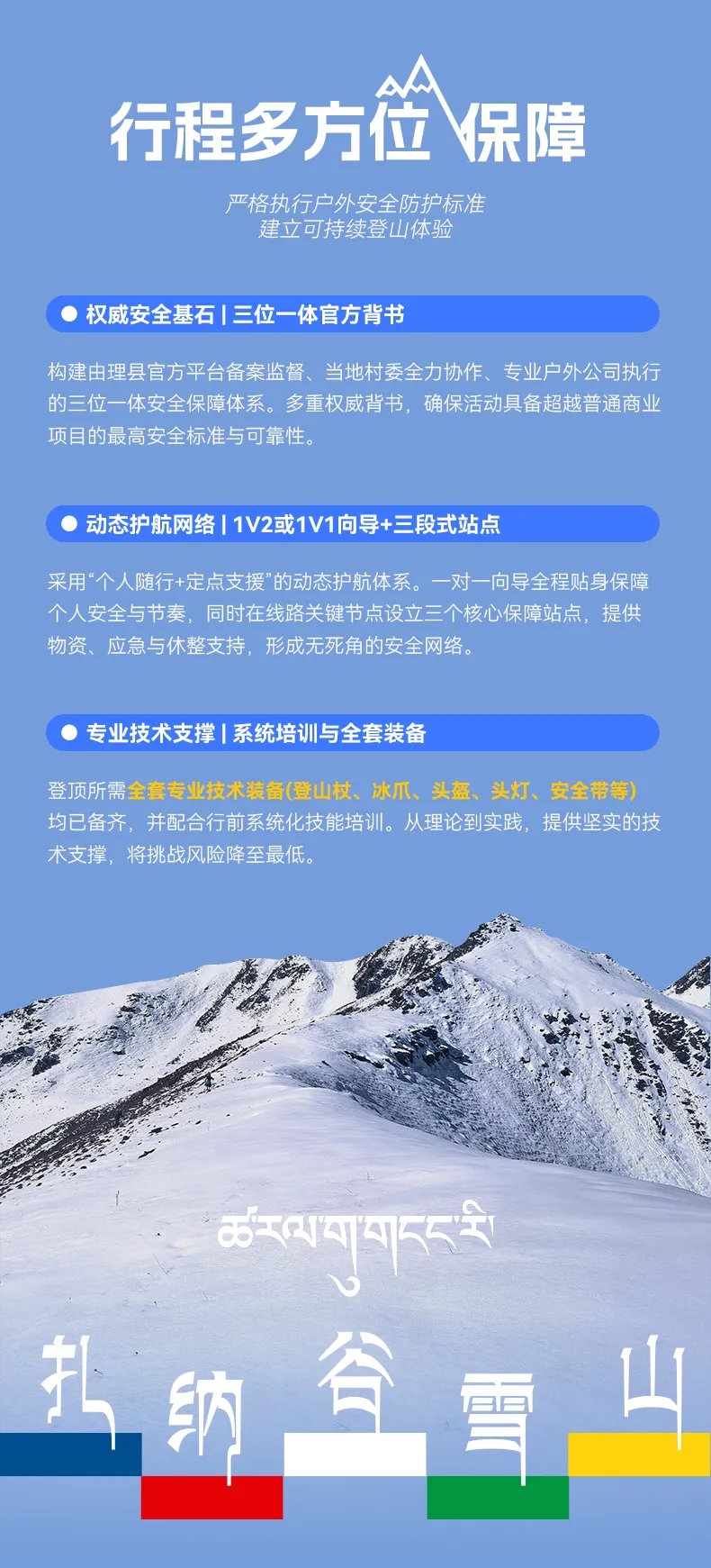 ②因扎纳谷雪山冬季积雪过大,峰顶5055处存在一定安全隐患,现只能徒步至扎纳谷新线左右的位置。