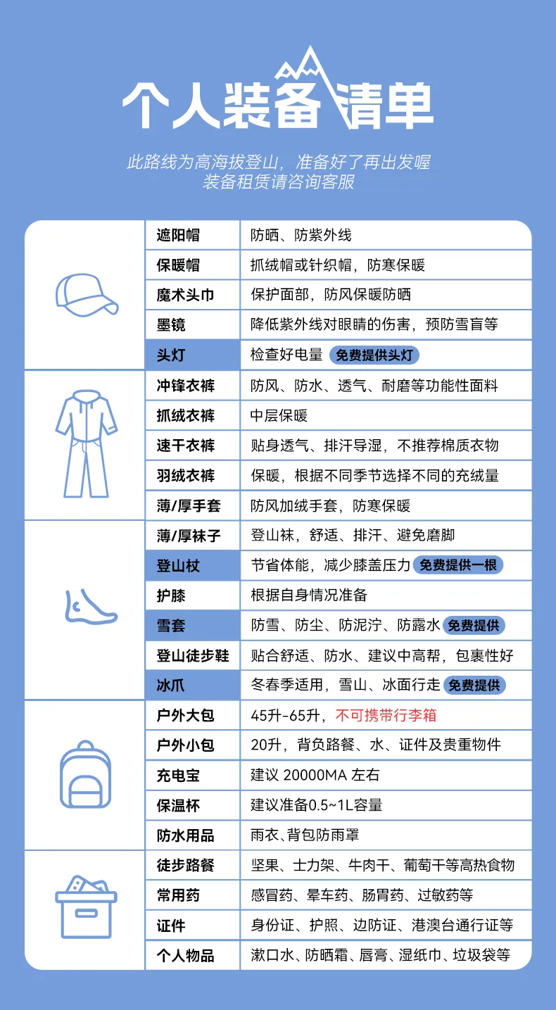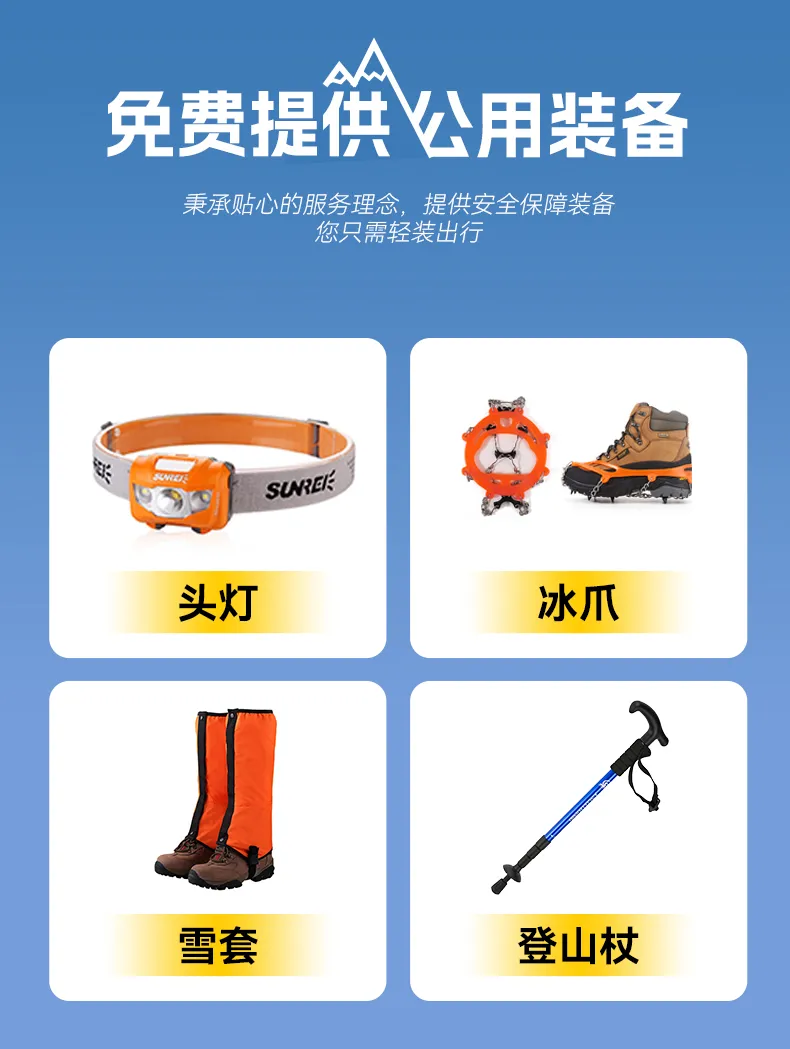 5.包括基础装备费用:登山杖、冰爪、头灯(自备:6节7号电池)、雪套、安全带、安全扣、牛尾绳、上升器、下降器(8字环、ATC)等技术性装备。