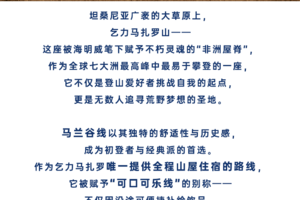 清晨(午夜至凌晨2点),开始攀登陡峭且多石的碎石或雪地,直至到达位于火山口边缘的吉尔曼点。继续前行,我们将登上乌呼鲁峰。每转一个弯都能看到令人震撼的美景。在山顶拍照留念,与亲朋好友分享这份美好。随后我们下山,在Kibo小屋停留午餐和休息,之后继续前往Horombo营地。