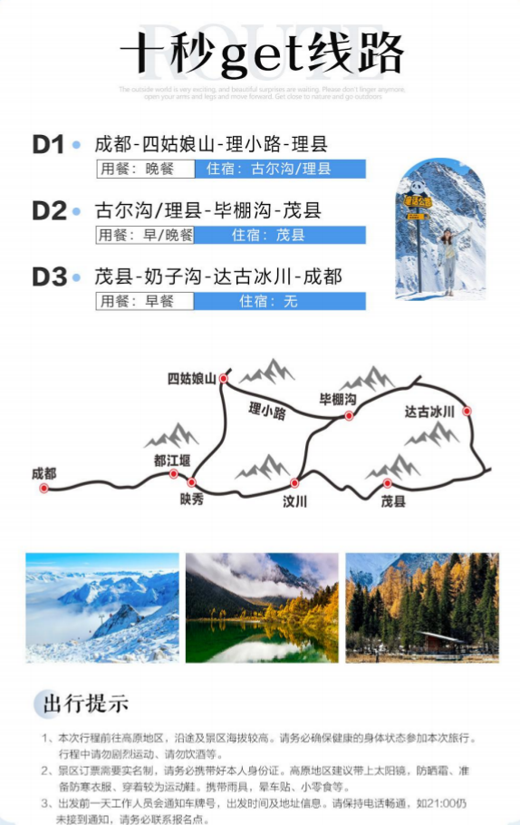 ②景区所在地区为藏羌等少数民族聚居区,在旅游中请尊重当地少数民族的宗教信仰和民俗风情;为了您的安全,请入夜后避免单独出行,个别思想开放者请不要在景区有所作为以免造成不必要的重大损失!自由活动期间,请注意保护自身人生安全及财物安全,过马路请小心;
