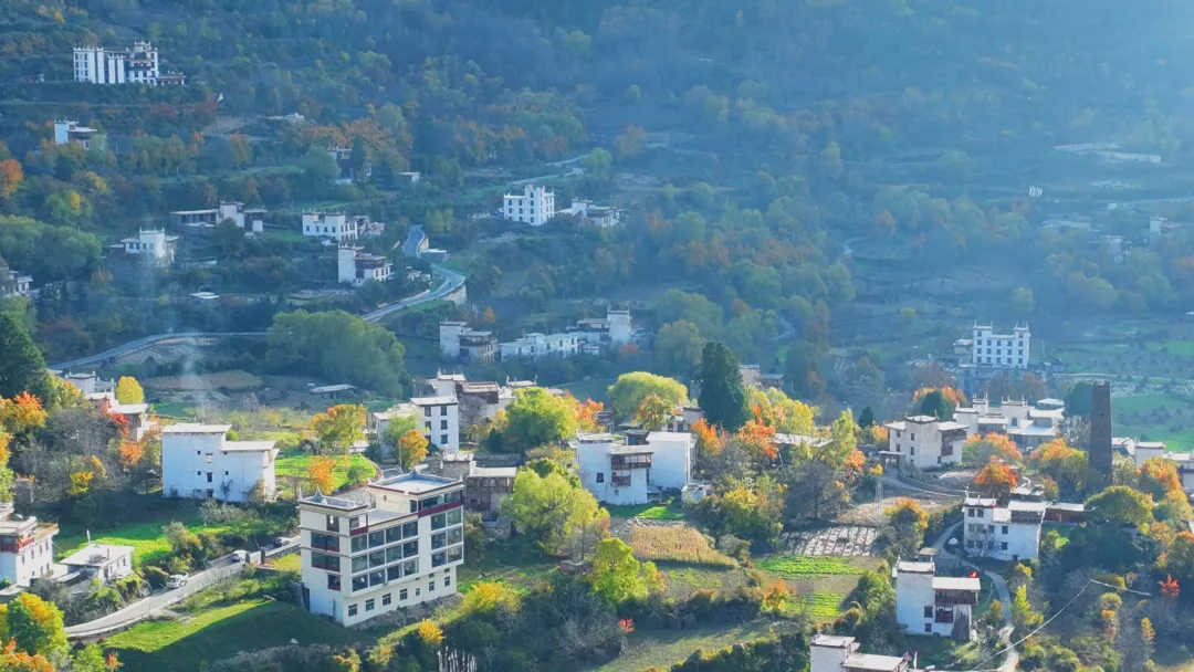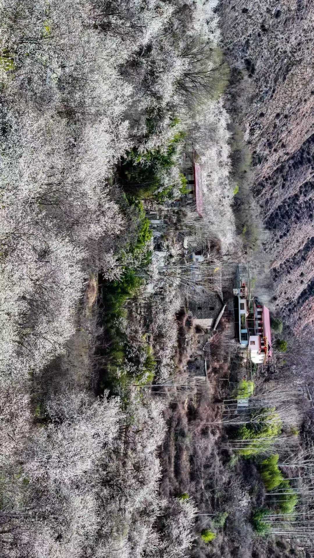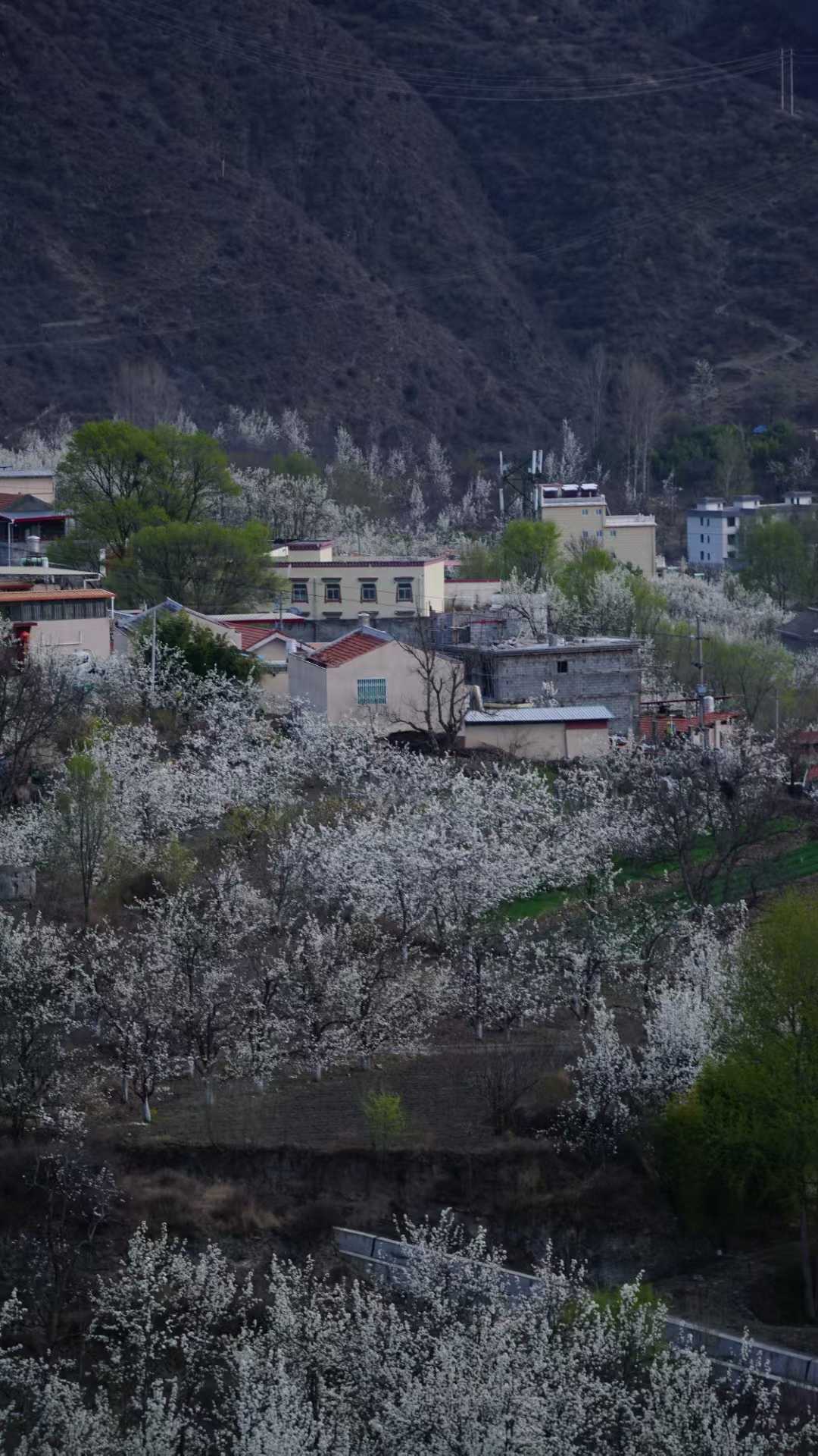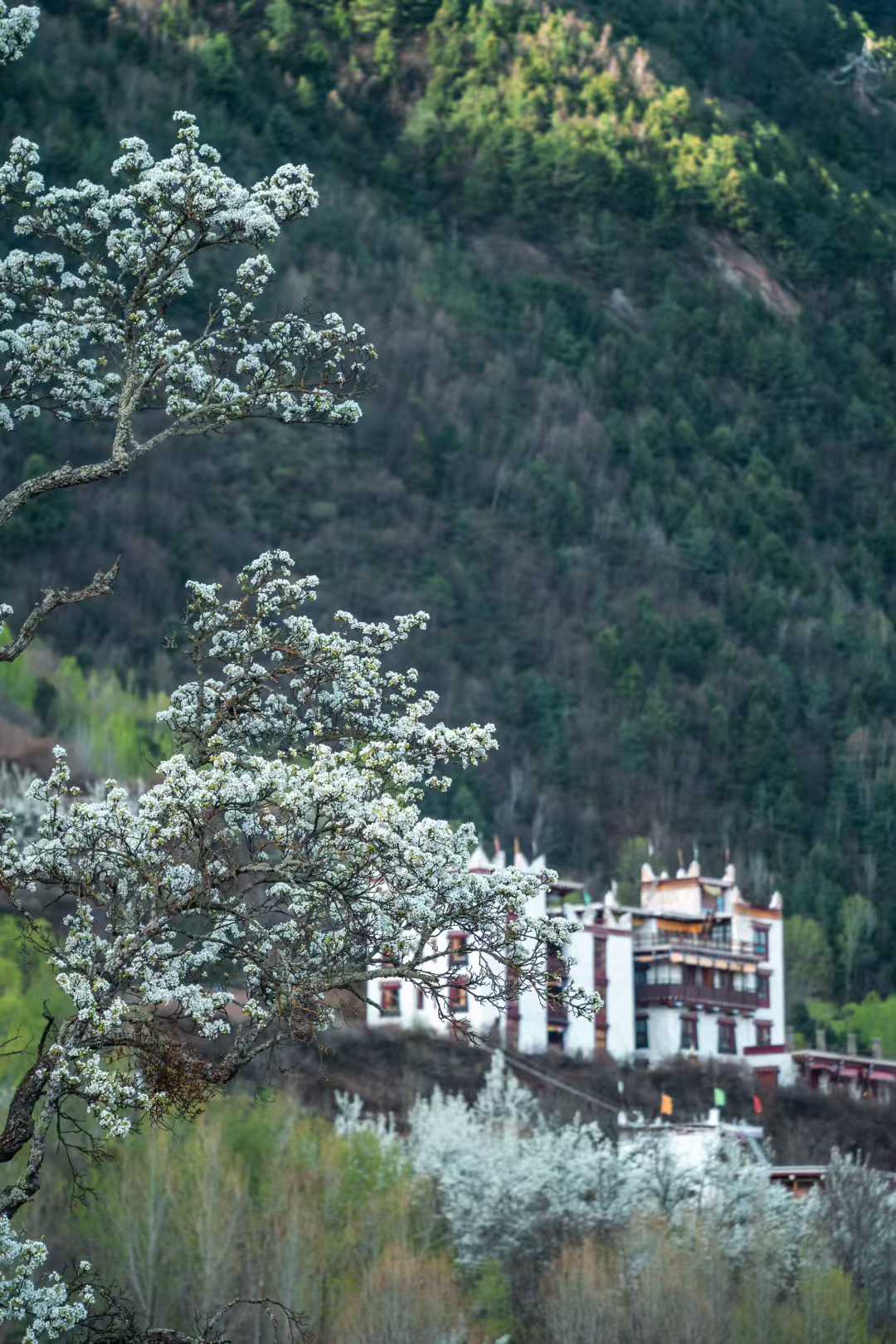 大片梨花顺着山势铺开,河谷里散落着丹巴风格的藏寨村落和古碉楼,白色花海与红色藏房形成极强的视觉对比。