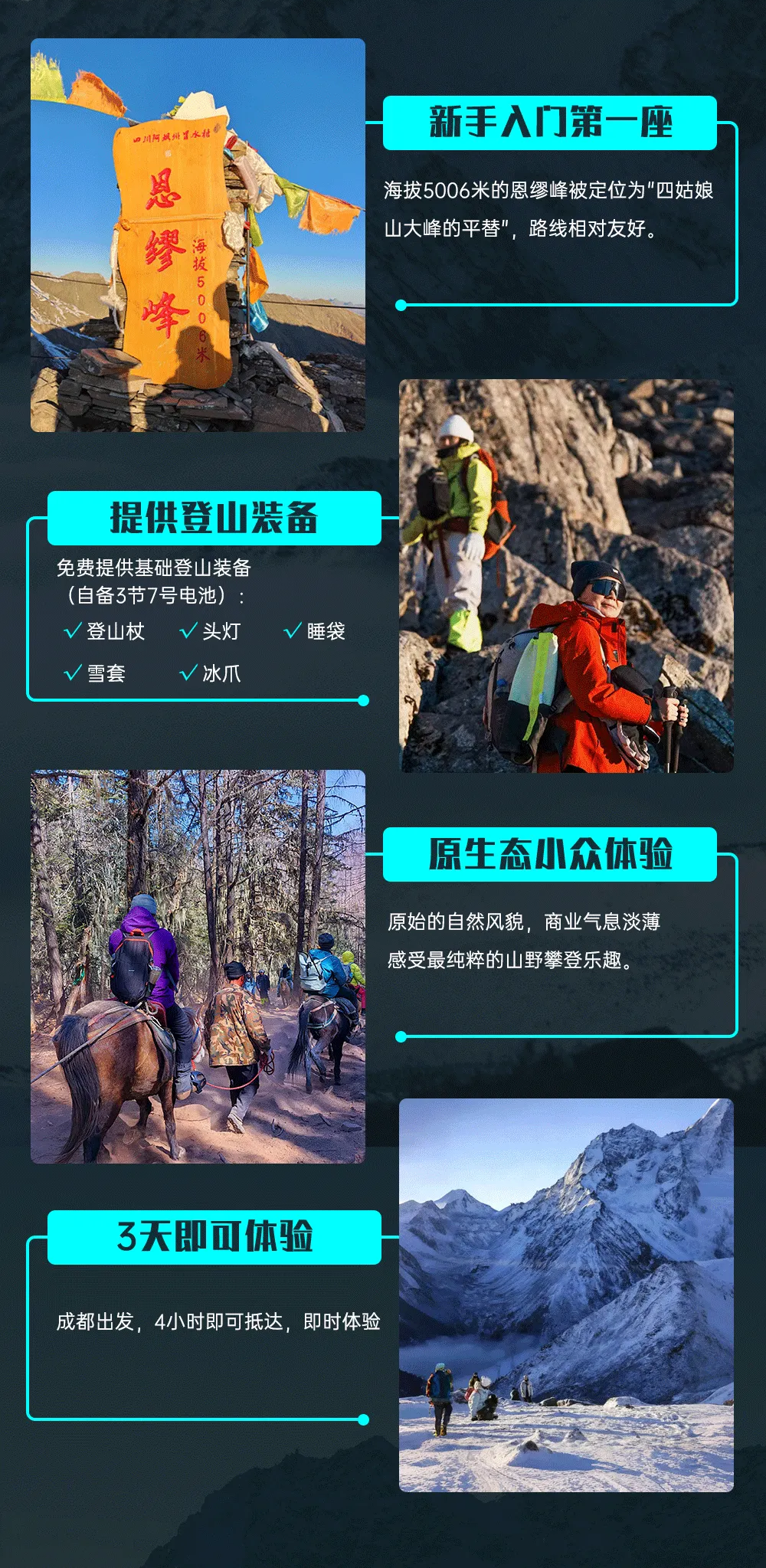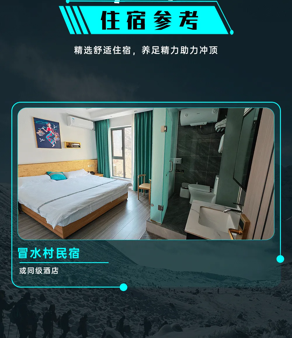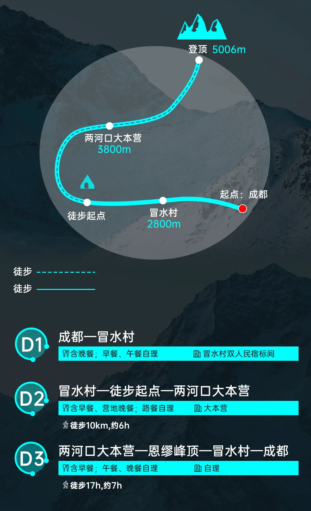 行程概览:早上3:00起床餐后整理行装,4点开始出发前往恩缪顶峰,距离3.5公里、路程4H左右,8点未到口需下撤,到达登顶点打卡拍照结束后下撤返回成都。