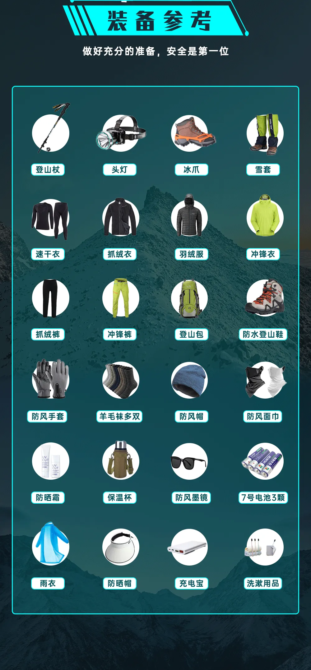 提供装备使用:冰爪+雪套+登山杖+头灯(需自备电池)。