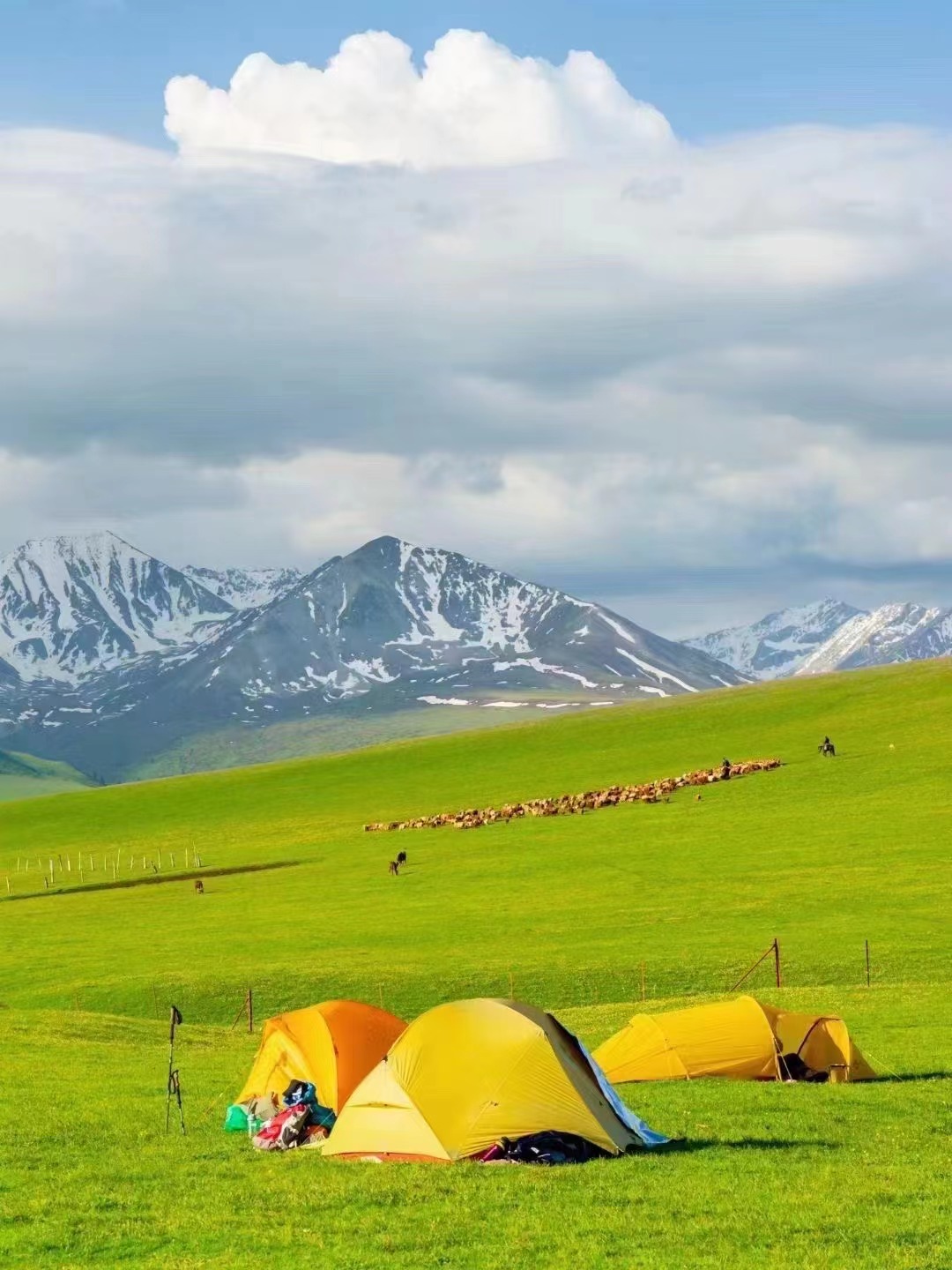 春季是新疆徒步的开端,山区的积雪逐渐消融,河谷与草原开始返青,各种野花如顶冰花、蒲公英悄然绽放。但此时山区昼夜温差大,高海拔区域仍有积雪,部分路段可能有融雪性洪水,需注意天气变化和路况。 |