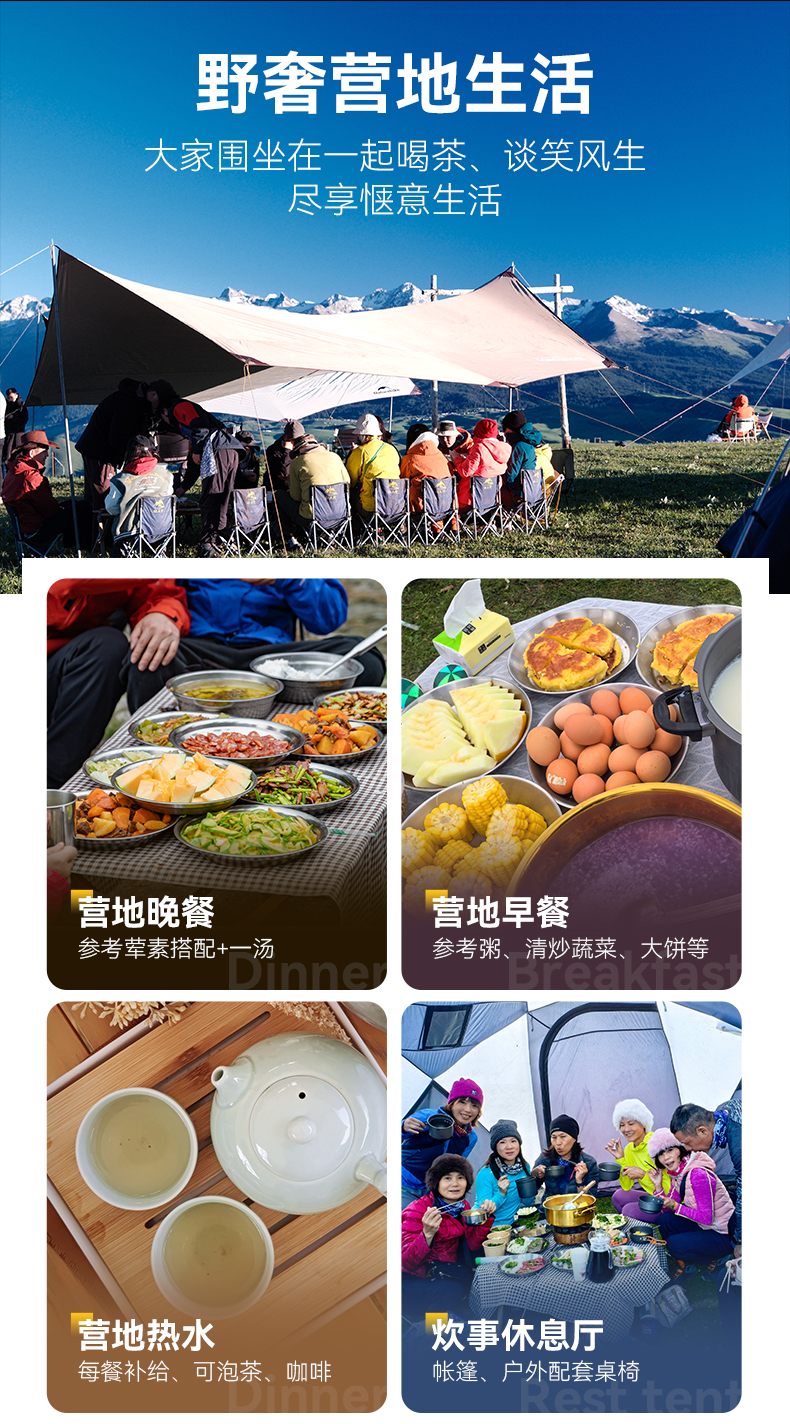 ● 营地:包含营地费(自带帐篷除外)。