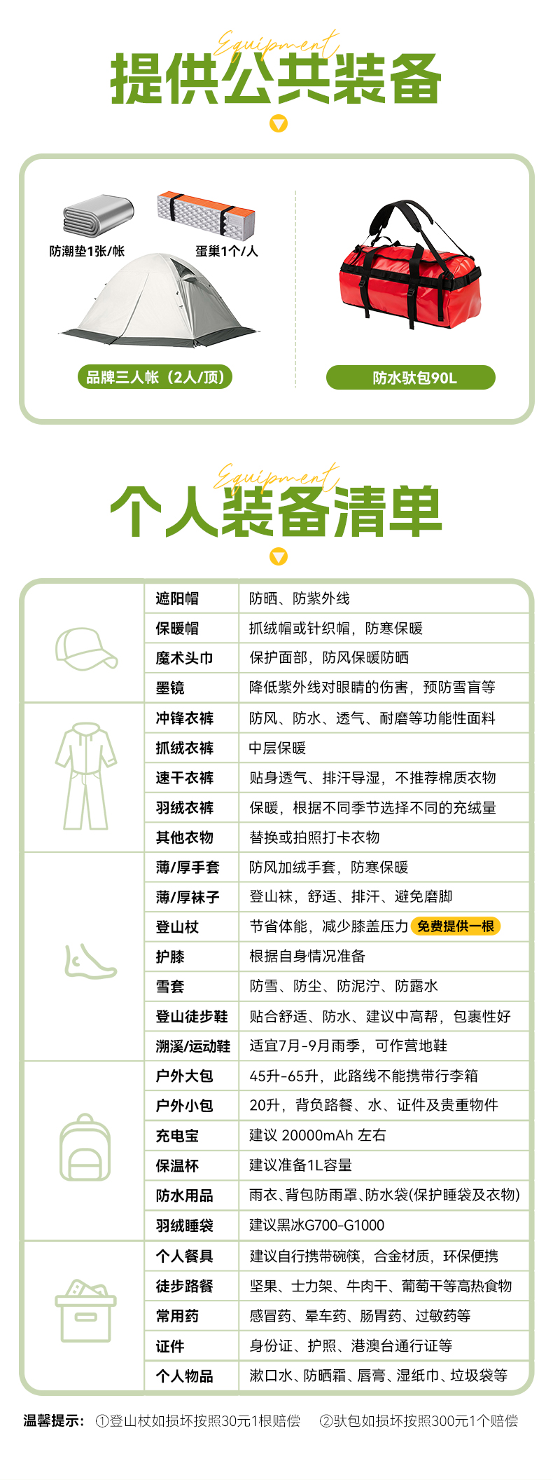 ● 装备:营地使用公用装备及提供的个人装备使用。