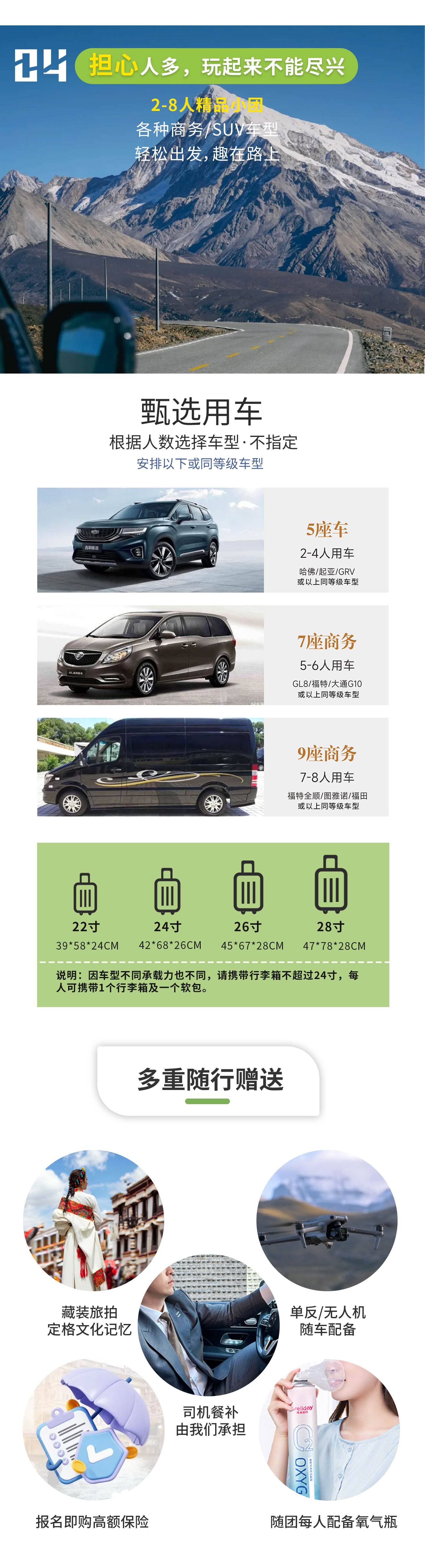 【关于行李箱】因不同车型承载力不同,出行建议携带行李箱不超过24寸;每人仅携带一个行李箱;如行李箱携带过大,导致车内拥挤,我社不满足免费换车诉求。