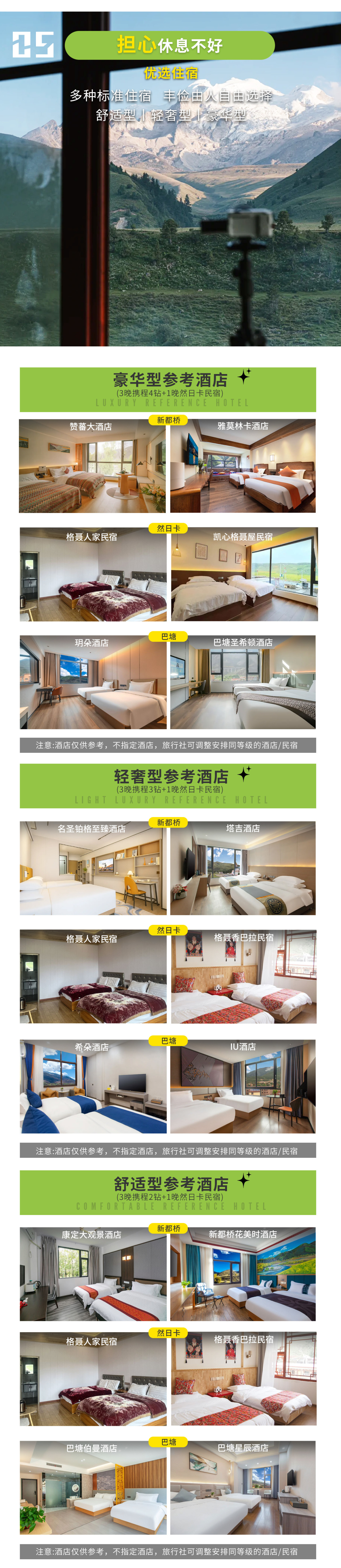 ■ 所列3晚酒店+1晚然日卡民宿住宿(报名默认标间,有大床/亲子间/三人间需求尽量安排),藏区条件有限,住宿标准不可与城市相比较, 建议自带洗漱用品,如对住宿要求高建议选择高标准住宿套餐 ;