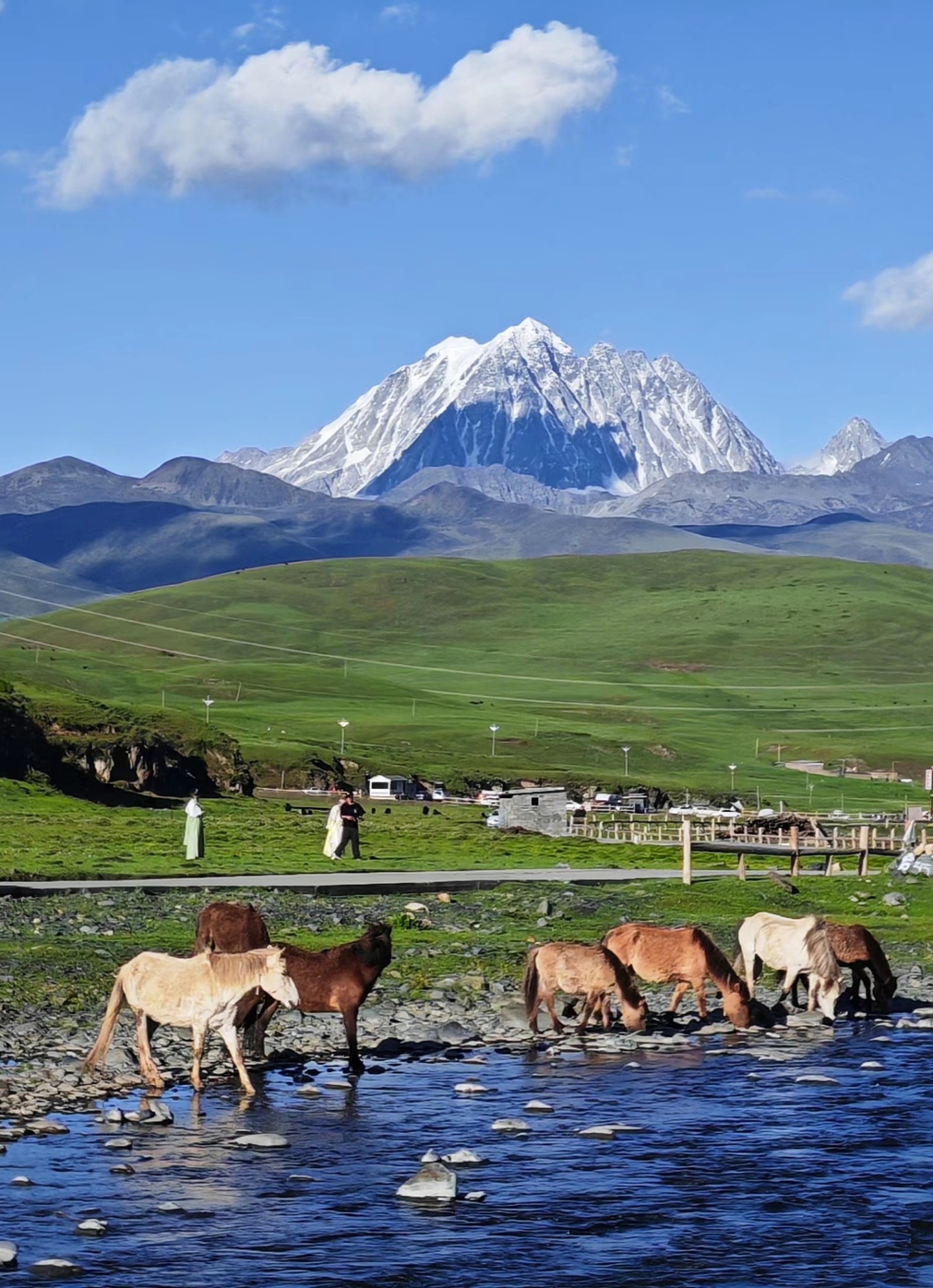 午餐后前往格聂神山,沿途欣赏高原草甸、雪山和湖泊的美景。抵达格聂神山脚下,远眺格聂三神山(格聂主峰、肖扎峰、喀麦隆峰),感受神山的雄伟与神圣。之后前往格聂神山附近的野温泉,体验高原温泉的独特魅力。温泉周围风景如画,泡温泉的同时可以欣赏雪山和草原的美景。晚上入住然日卡村或格聂镇民宿,结束一天的行程!