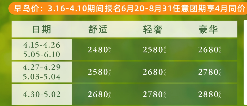 ★早鸟价:3.16-4.10期间报名6月20-8月31任意团期享4月同价