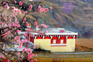 与藏式民居、远山雪景相融