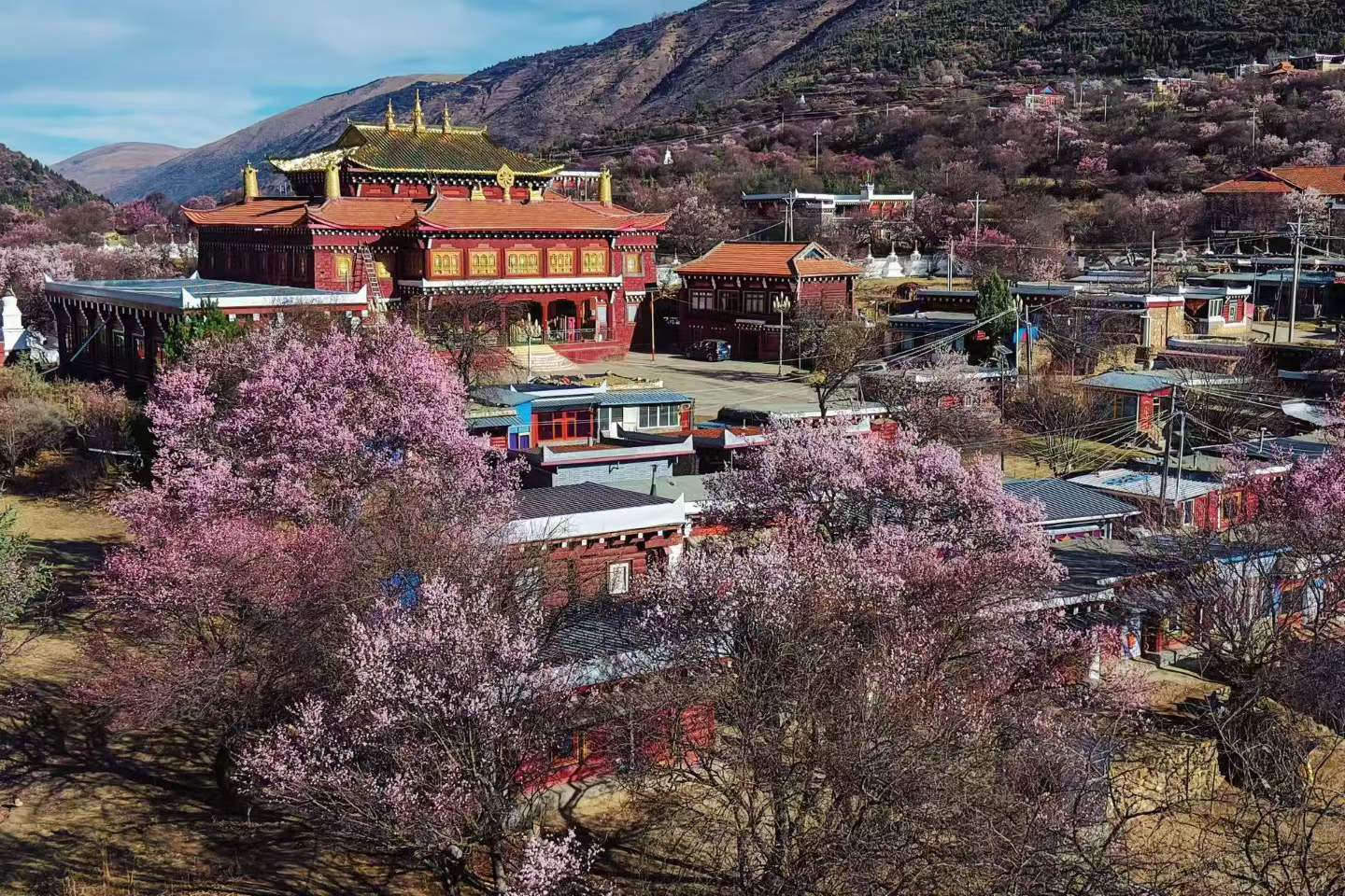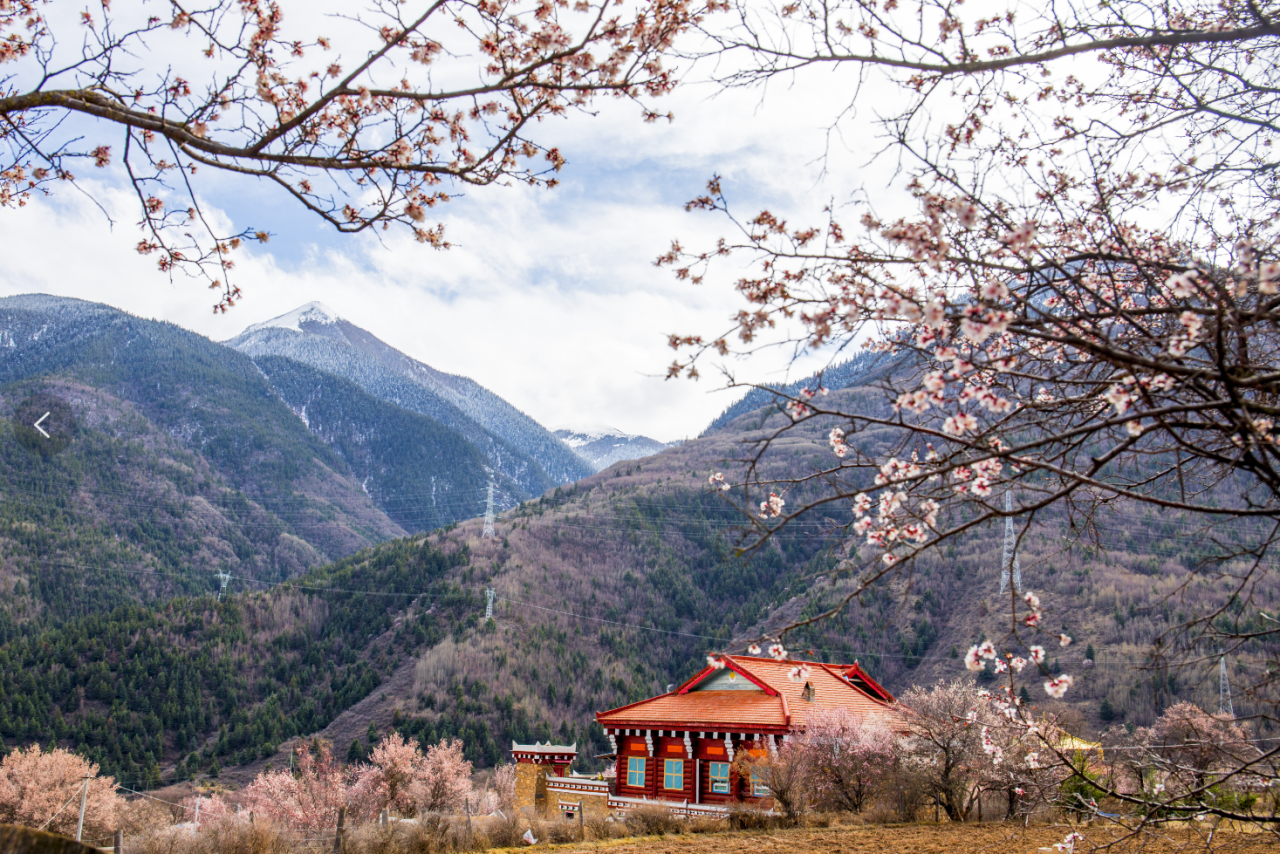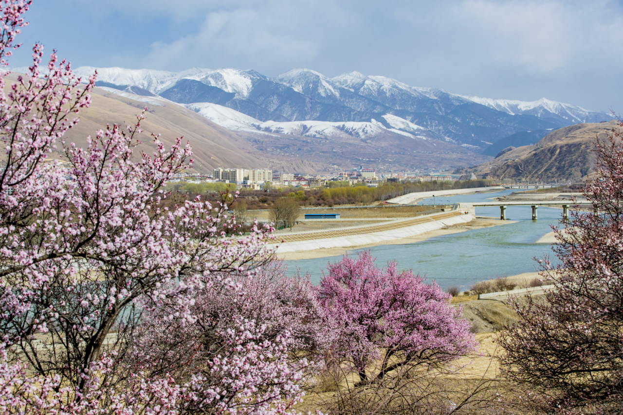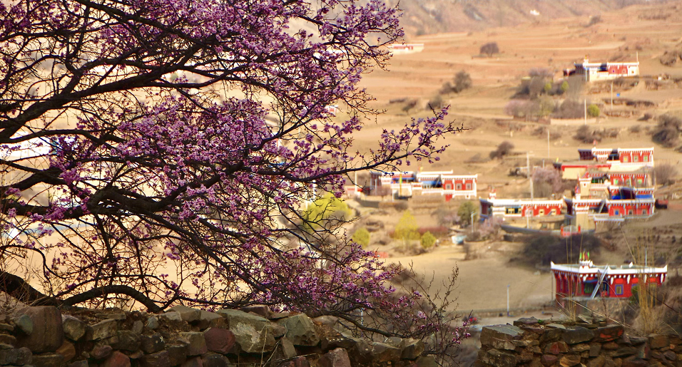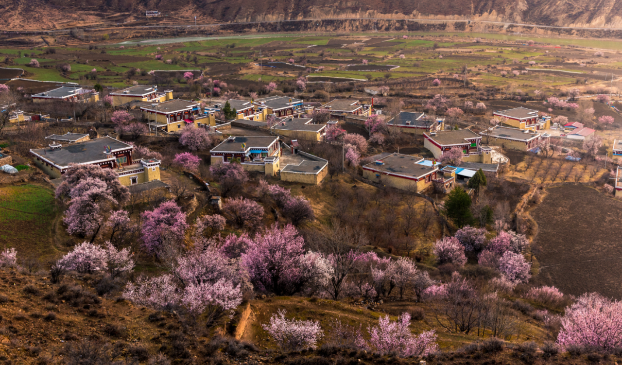 粉白花海、河谷溪流、藏乡风情相融合