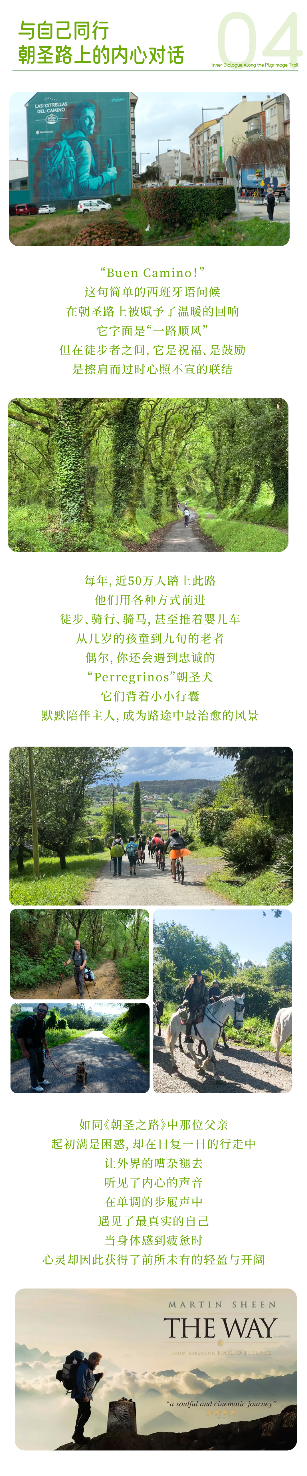 从距离圣地亚哥113公里的萨里亚正式开始我们的朝圣徒步之旅。今天将会经过历史悠久的古村落,很多村落都是早期为服务朝圣者而建。沿着米纽河(Miño)河向下,我们抵达今天的目的地——普埃托马林镇。这个小镇在20世纪60年代被整体搬迁并重建于河床后方,原本的中世纪老城则沉眠于Belesar水库底部。水量不多的季节,或许还可以看到老城的轮廓浮出水面。