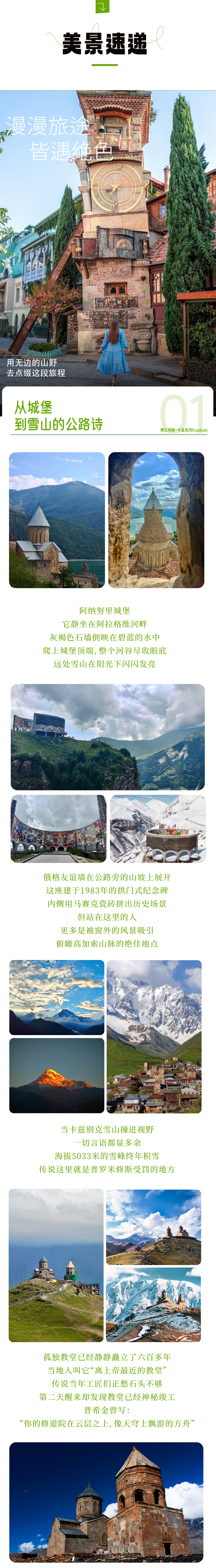 早餐后,出发前往高加索著名的卡兹别克山区,沿途观赏【阿纳努里城堡】《孤单星球-外高加索三国》封面上的河畔城堡。如今的阿纳努里城堡,已成为格鲁吉亚著名的名片之一,它的存在而吸引了许多游客来到这片神奇而美丽的土地。城堡坐落在半山腰上,一旁的湖水如绿宝石般的阿拉格维湖,与城堡绿色的穹顶遥相呼应、相得益彰,更远处则是巍峨壮观的外高加索山脉环绕在四周,古典与秀美在此被演绎的淋漓尽致。