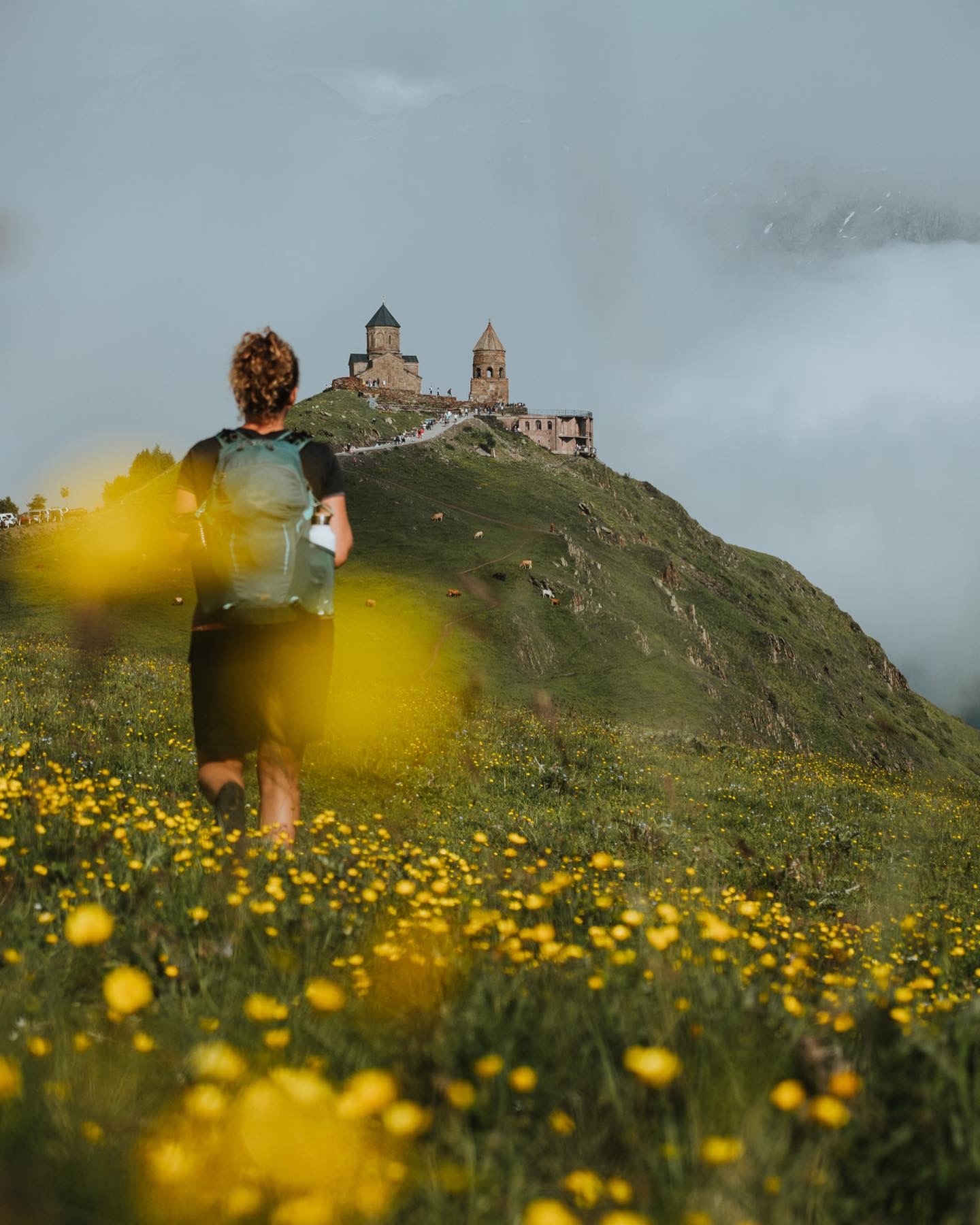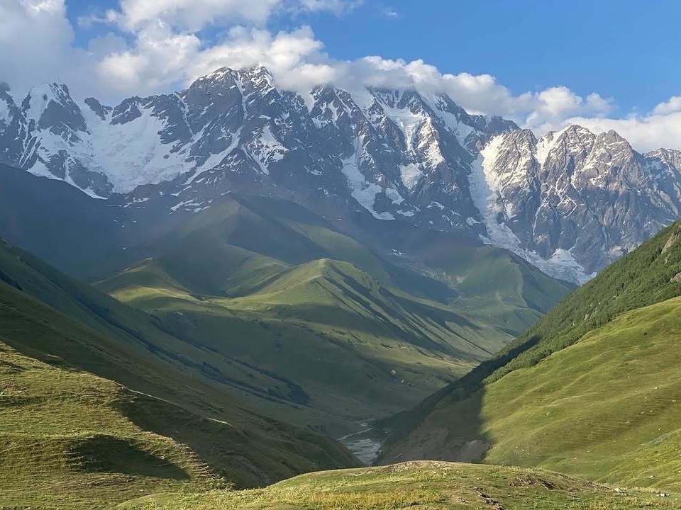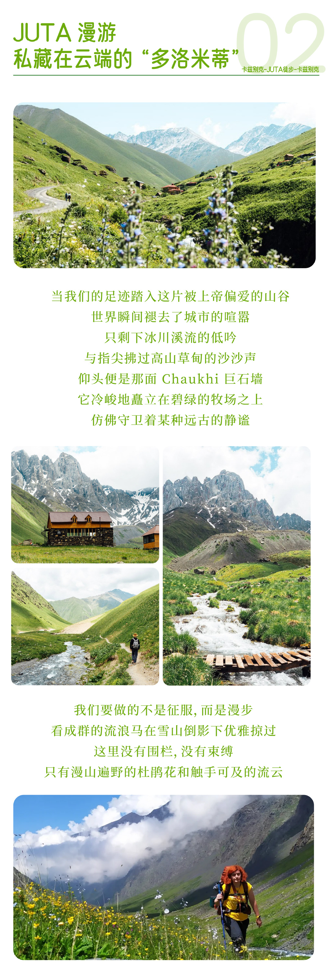 清晨从卡兹别克小镇出发,乘坐越野车前往海拔约2200米的JUTA村,开启高加索经典轻徒步。沿成熟步道上行,穿越高山草甸、溪流与松林,一路直面Chaukhi峭峰群,雪山、河谷、石屋村落同框。