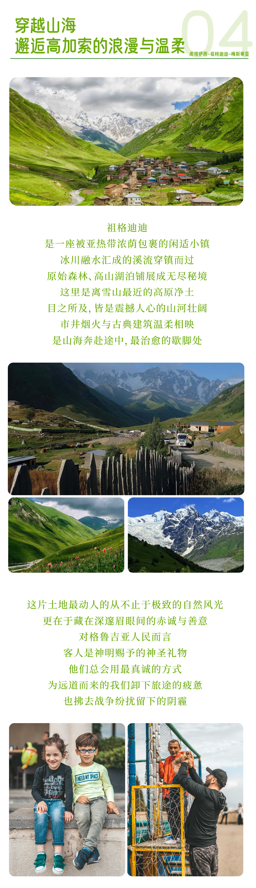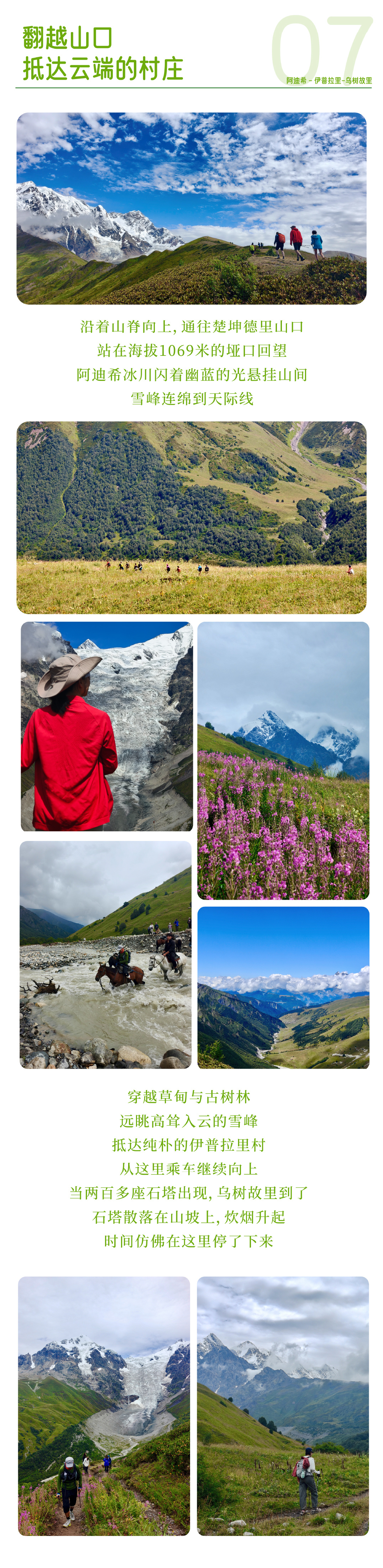 从阿迪什出发,踏上18公里的高加索山地之旅,前往伊普拉里。历时8-9小时,挑战680米上升与780米下降的起伏步道。徒步途中,冰川悬挂山间,溪水奔流而下,野花如织,仿佛置身仙境之中。穿越草甸与古树林,远眺高耸入云的雪峰,抵达纯朴迷人的伊普拉里村,感受当地村民热情的笑容与斯瓦涅季传统生活气息。一路风景如画,体验自然与人文融合的壮丽。随后我们坐车前往乌树故里,入住名宿。这座欧洲最高的古老村落,仿佛穿越千年而来:高塔耸立,古屋错落,冰川与雪峰环绕其间,静谧而神秘。漫步村中,时光仿佛停驻,尽享纯净与宁静。