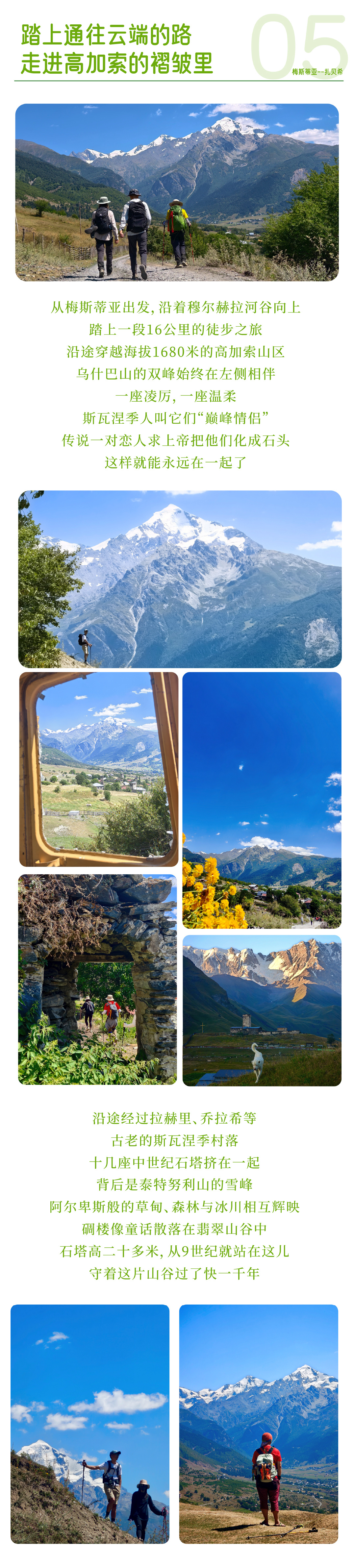 从梅斯蒂亚出发,踏上一段16公里的徒步之旅,向着迷人的村落进发。沿途穿越高加索山区,目之所及皆为旖旎美景:阿尔卑斯般的草甸、森林与冰川相互辉映,600米上升与380米下降交替,让行程富于变化。6至7小时的慢行中,呼吸纯净空气,远眺雪山映衬下的斯瓦涅季古塔群,仿佛置身于童话秘境。