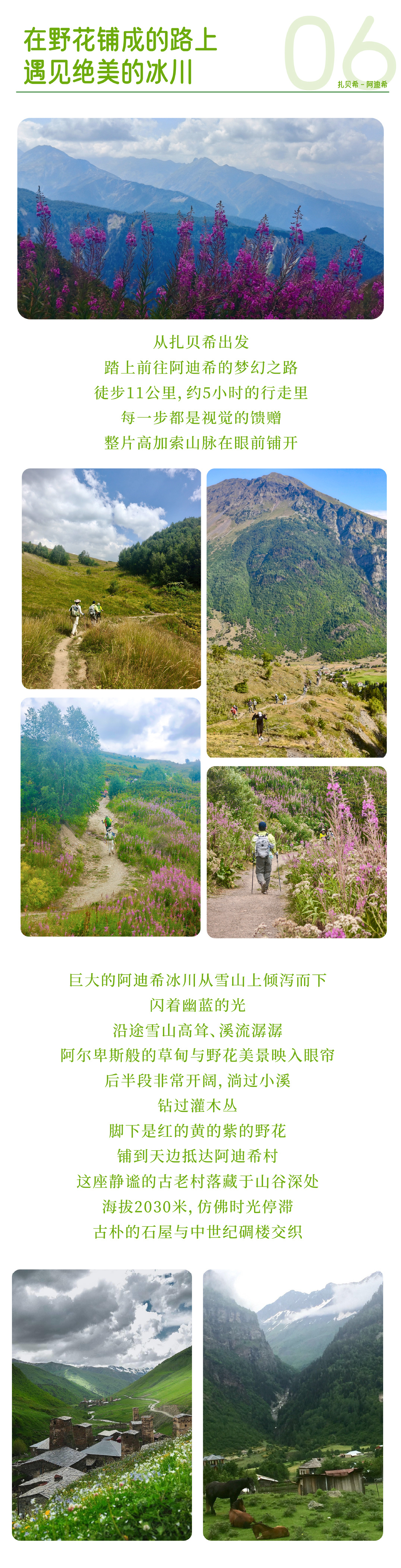 从扎别什出发,踏上前往阿迪什的梦幻之路,徒步11公里,时长约5小时。一路海拔持续攀升至2500米海拔,900米起伏的上坡与460米的下降让步伐更富趣味与挑战。沿途雪山高耸、溪流潺潺,阿尔卑斯般的草甸与野花美景映入眼帘。抵达阿迪什村,这座静谧的古老村落,藏于山谷深处,仿佛时光停滞,古朴的石屋与中世纪碉楼交织,令人心生向往。在徒步中,感受自然与历史交织的浪漫。
