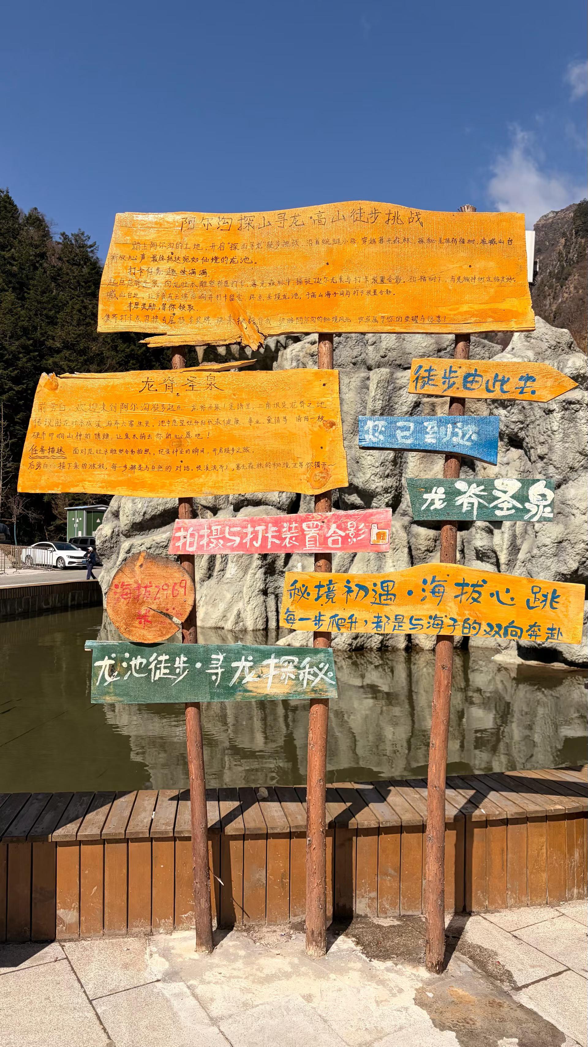 Tips:阿尔沟“探山寻龙”高山徒步挑战赛,共设3个打卡点位,分别为起点【三角坝许愿池】、中途点【祈福树】、终点【龙池】,挑战者须完成3处打卡点任务,并成功登顶龙池,按要求完成挑战将获得阿尔沟限定徒步奖牌1枚~