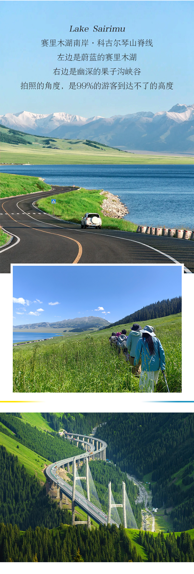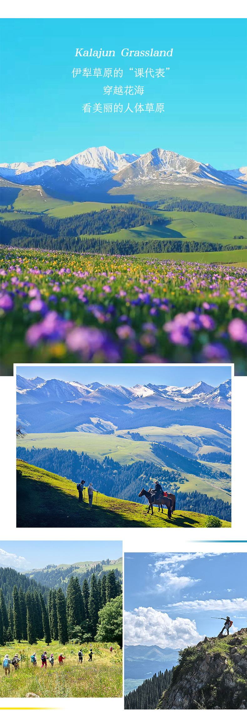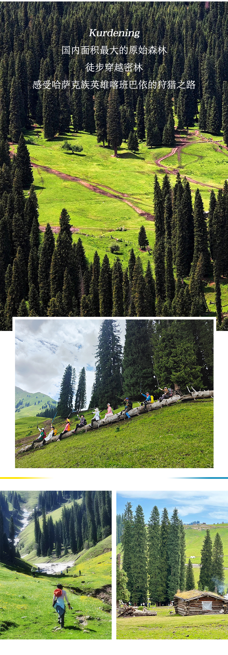 这是一场深入天山山脊的绿野盛宴,我们摒弃冗长的里程只为萃取极致一一在夏塔的冰川雪岭间行走,在喀拉峻的立体曲面与花海中徜徉,深入库尔德宁的原始云杉林深呼吸,最终抵达赛里木湖。