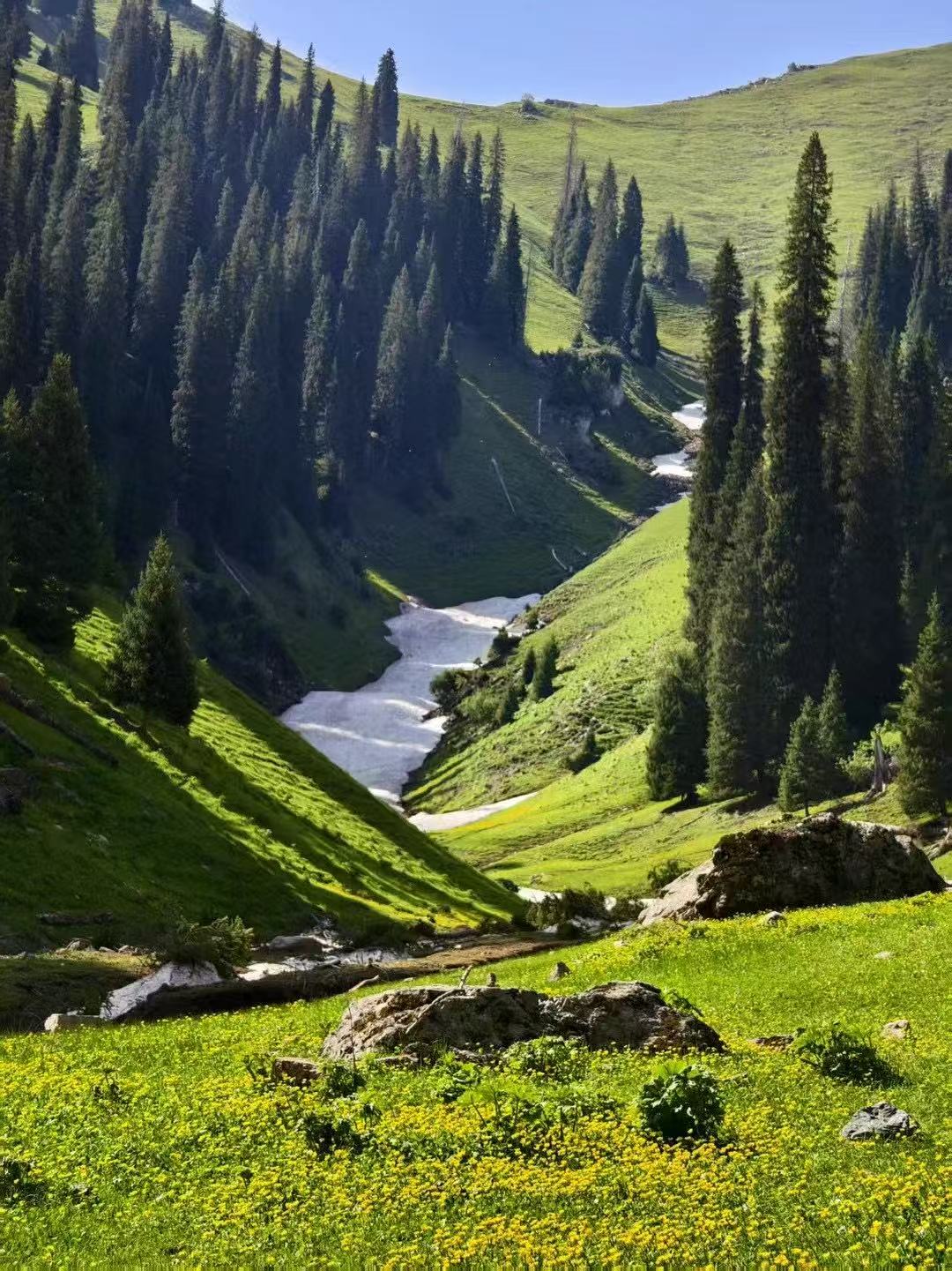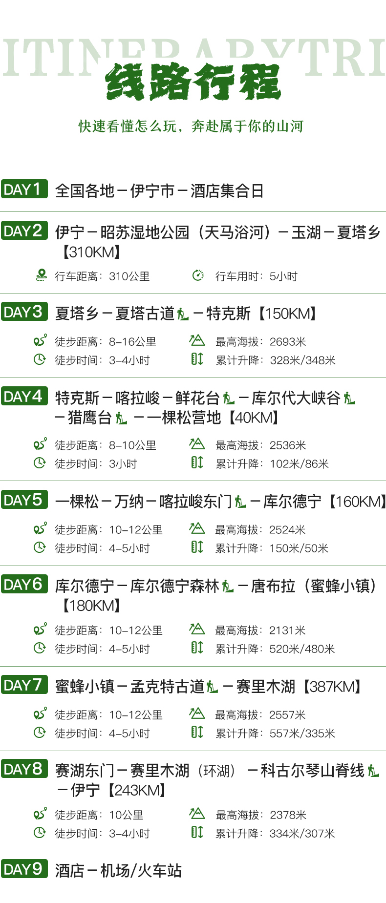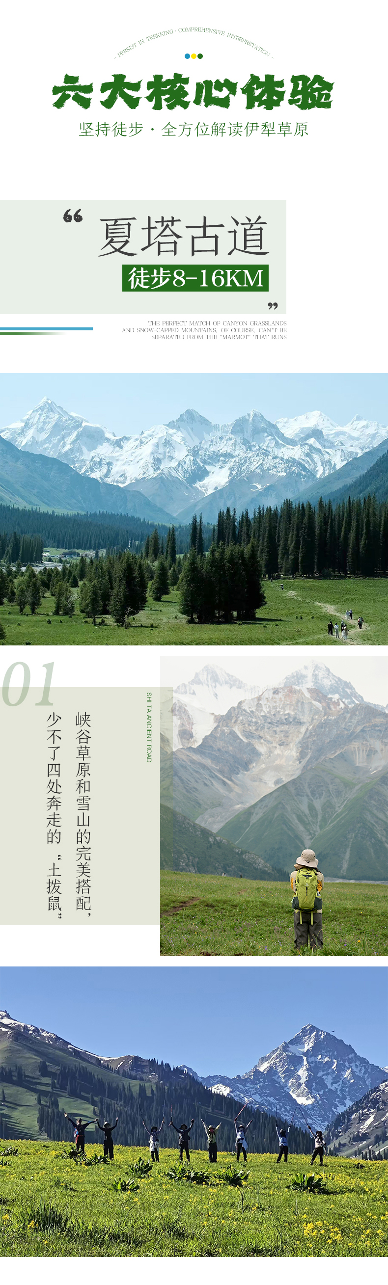 这是一场深入天山山脊的绿野盛宴,我们摒弃冗长的里程只为萃取极致一一在夏塔的冰川雪岭间行走,在喀拉峻的立体曲面与花海中徜徉,深入库尔德宁的原始云杉林深呼吸,最终抵达赛里木湖。