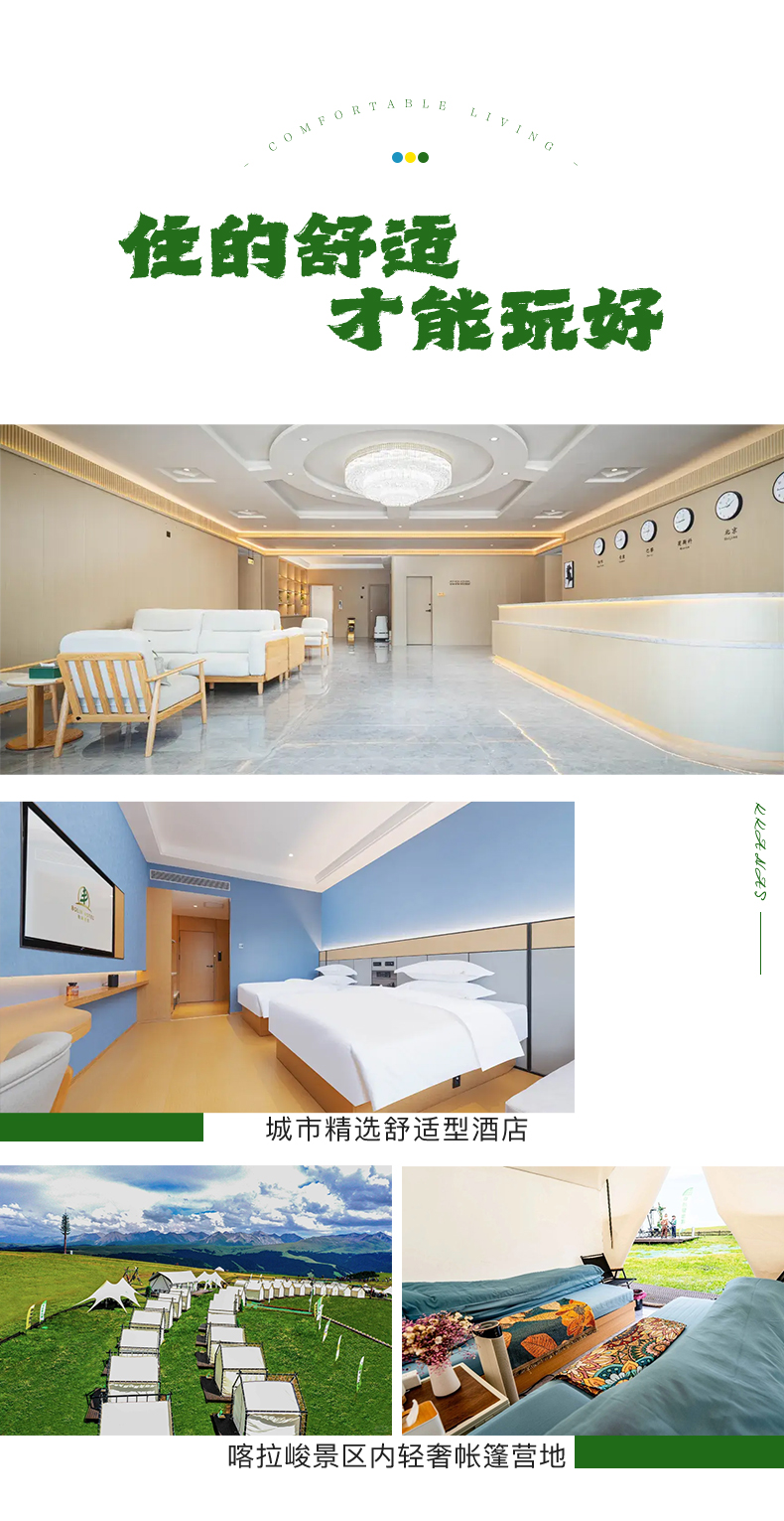 二、住宿:全程8晚住宿,其中6晚舒适性酒店,1晚景区轻奢帐篷两人间,1晚小镇经济型酒店。(伊宁市2晚,夏塔乡1晚,特克斯县1晚,猎鹰台营地1晚,库尔德宁镇1晚,蜜蜂小镇1晚、赛里木湖景区东门1晚);