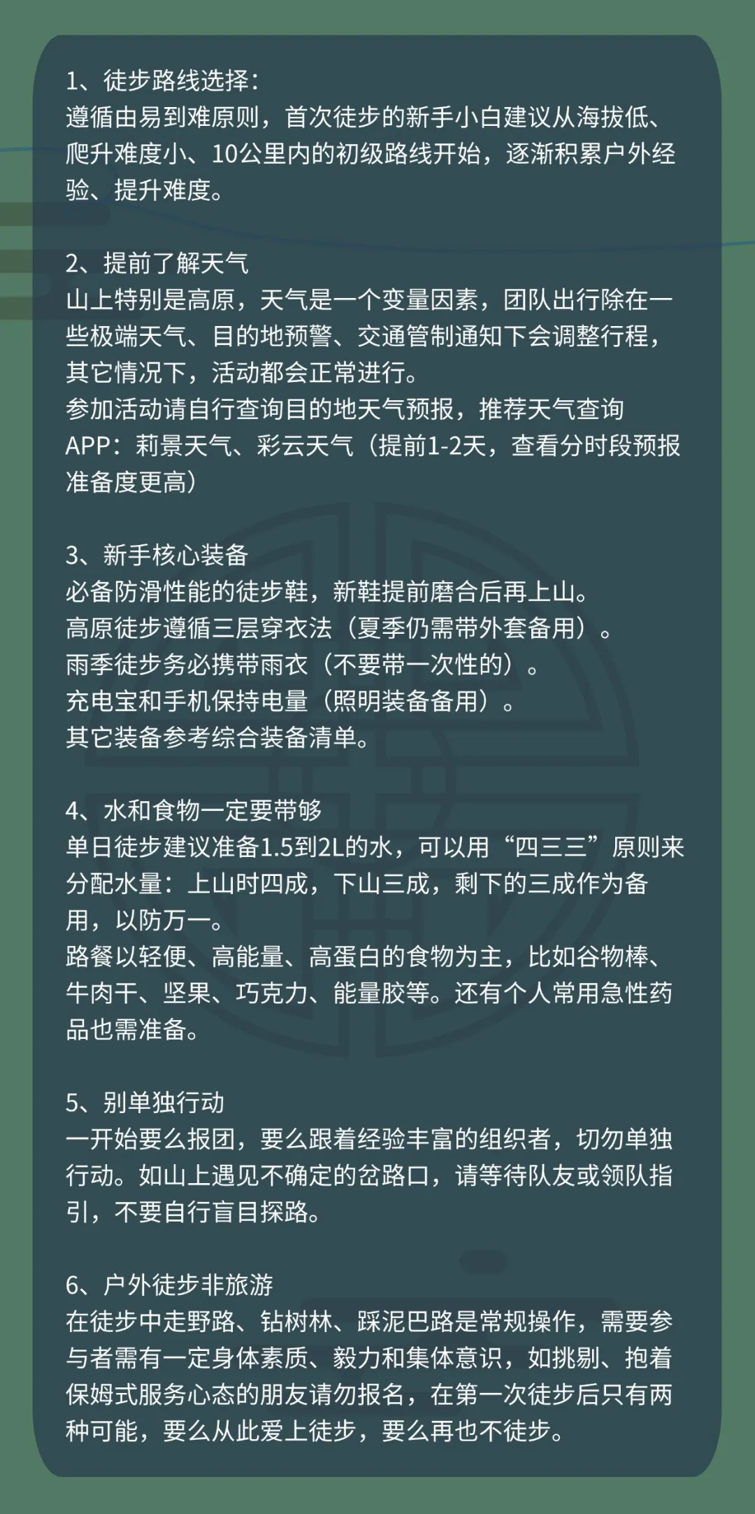 2.全程听从领队安排,严禁迟到,擅自冒险行动等后果自负;