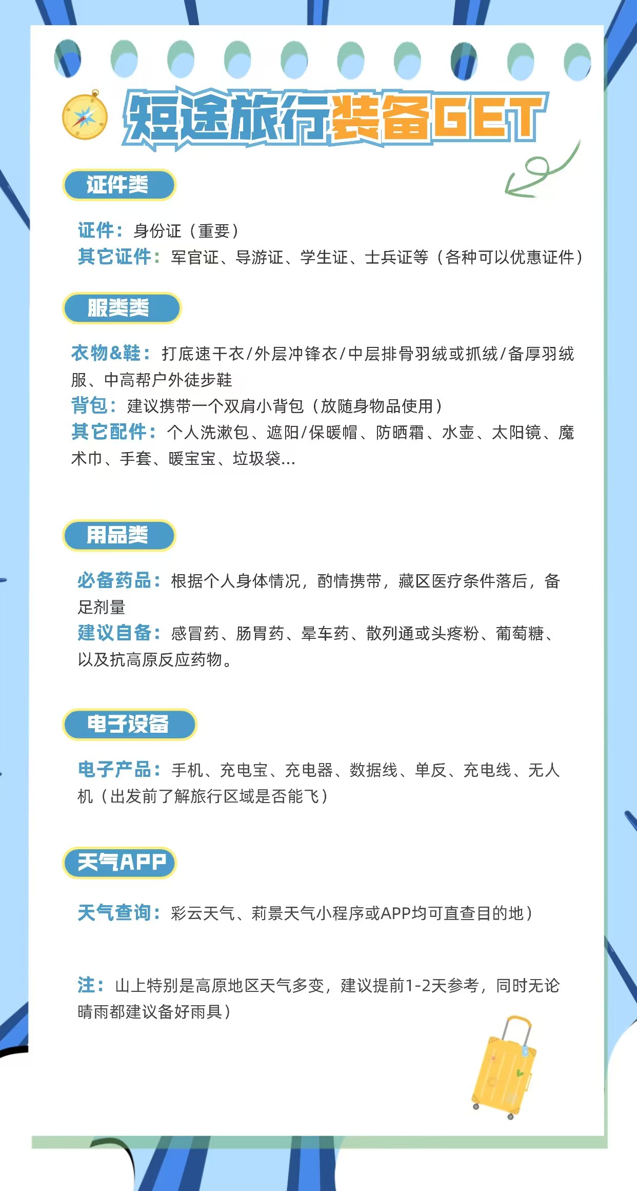 1、必备装备:运动鞋、雨具、春秋外套、手机、充电宝、洗漱用品等