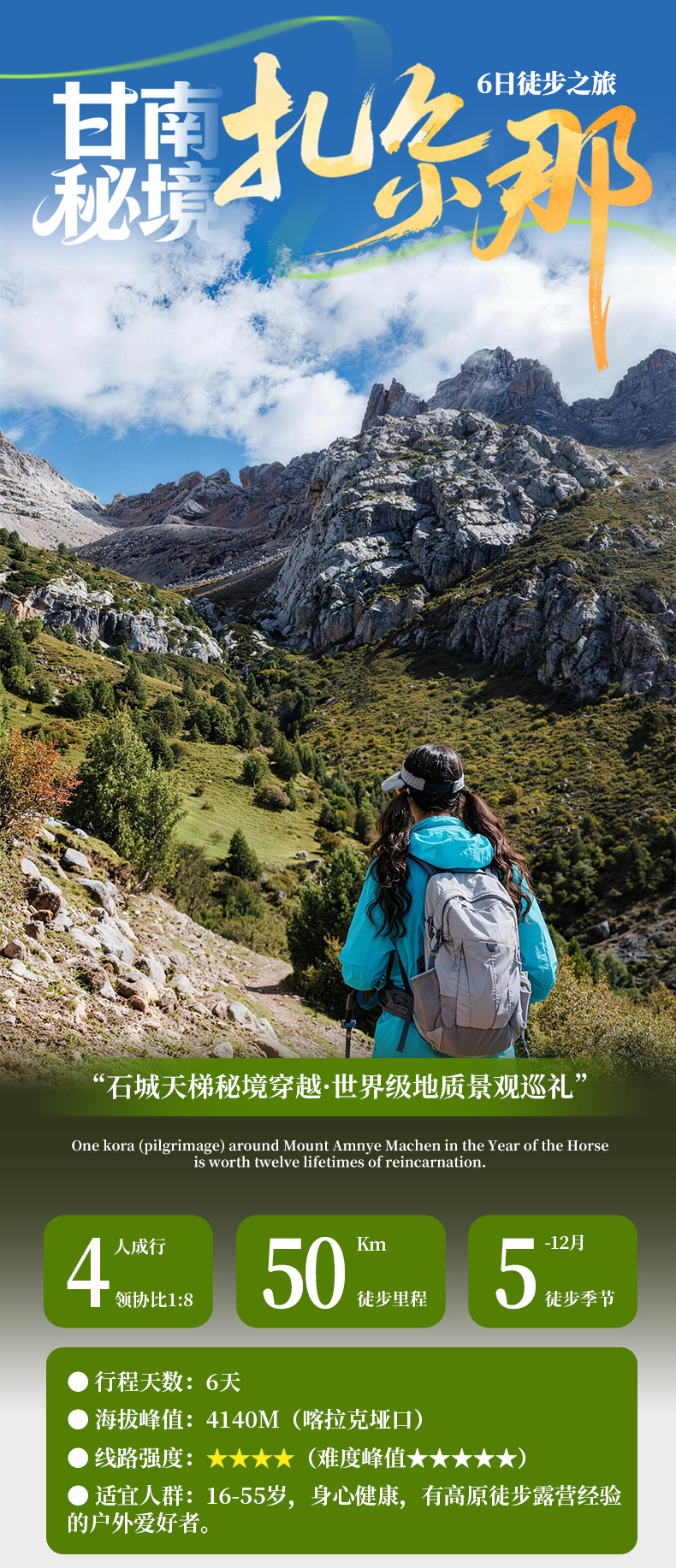 ▲ 适宜人群:本产品以徒步旅行为主,适用于18-55岁身体健康、体能良好人士(如有超龄且身体状况良好,经常有户外运动可联系客服沟通确认)。