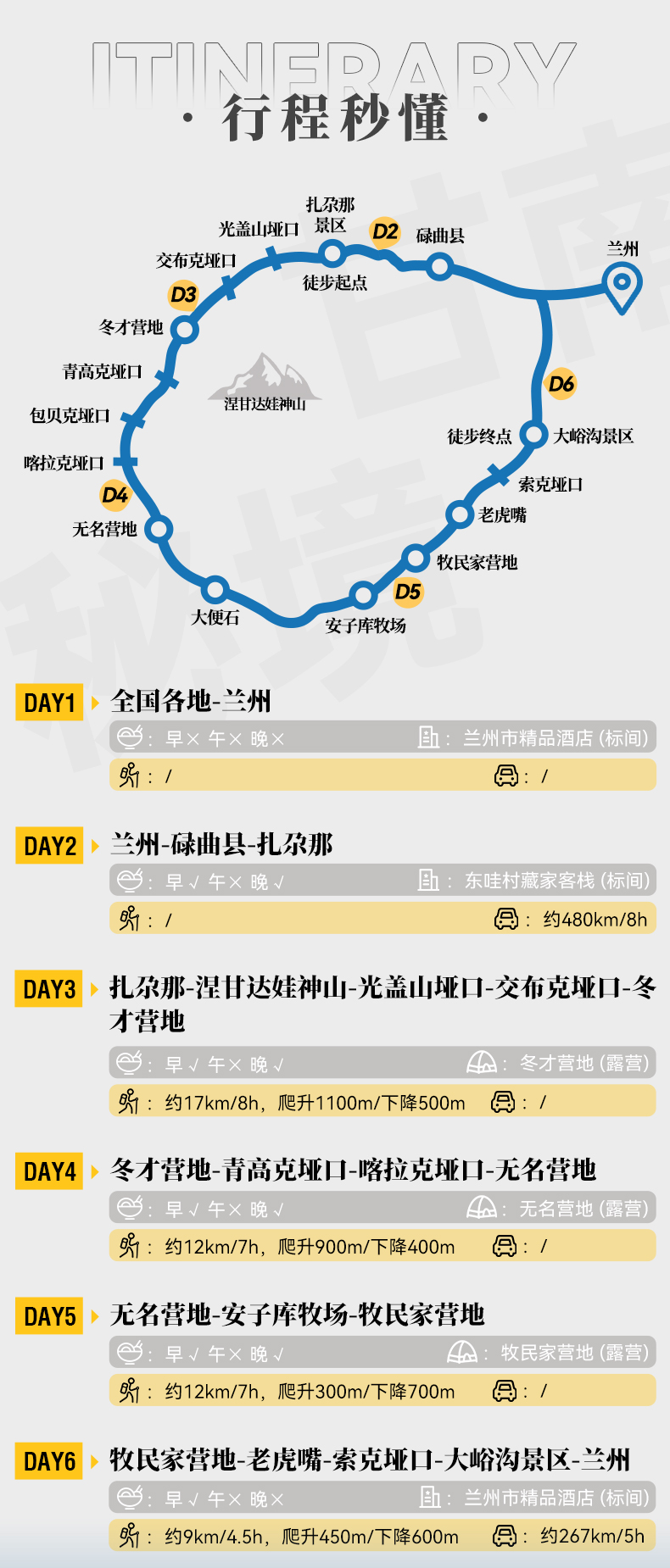 ● 交通:兰州-迭部、岷县-兰州根据人数选择合适车型,< 10人选择公共交通。(其中包含①迭部-扎尕那中转车、②大峪沟中转车)以上交通均为一人一座。