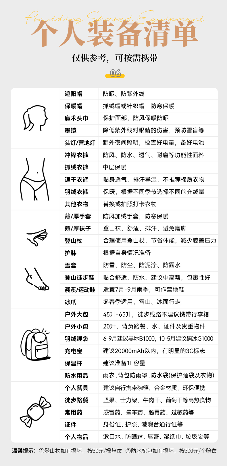 温馨提示:以上所有租用物品,如有损坏和遗失,将按照物品原价进行赔偿。 |