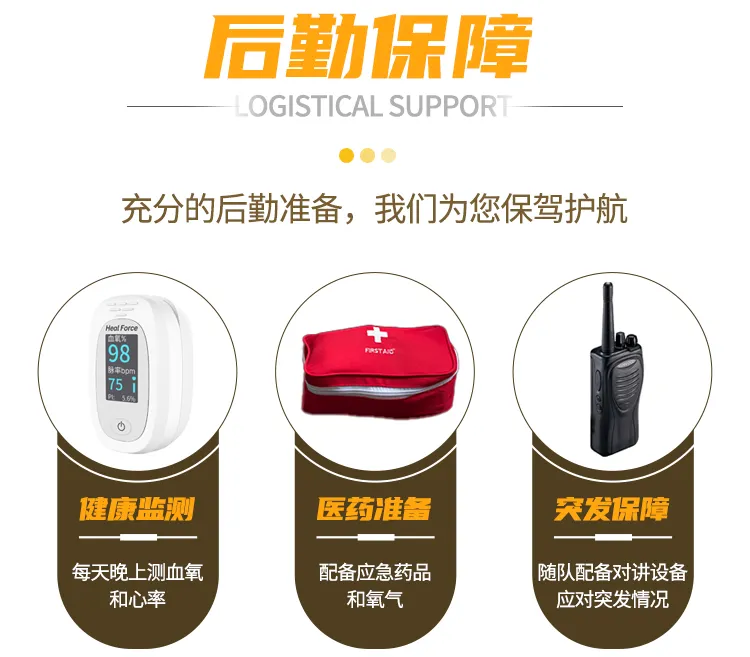 5、装备:配备对讲机、高原钢瓶急救氧、急救包等;